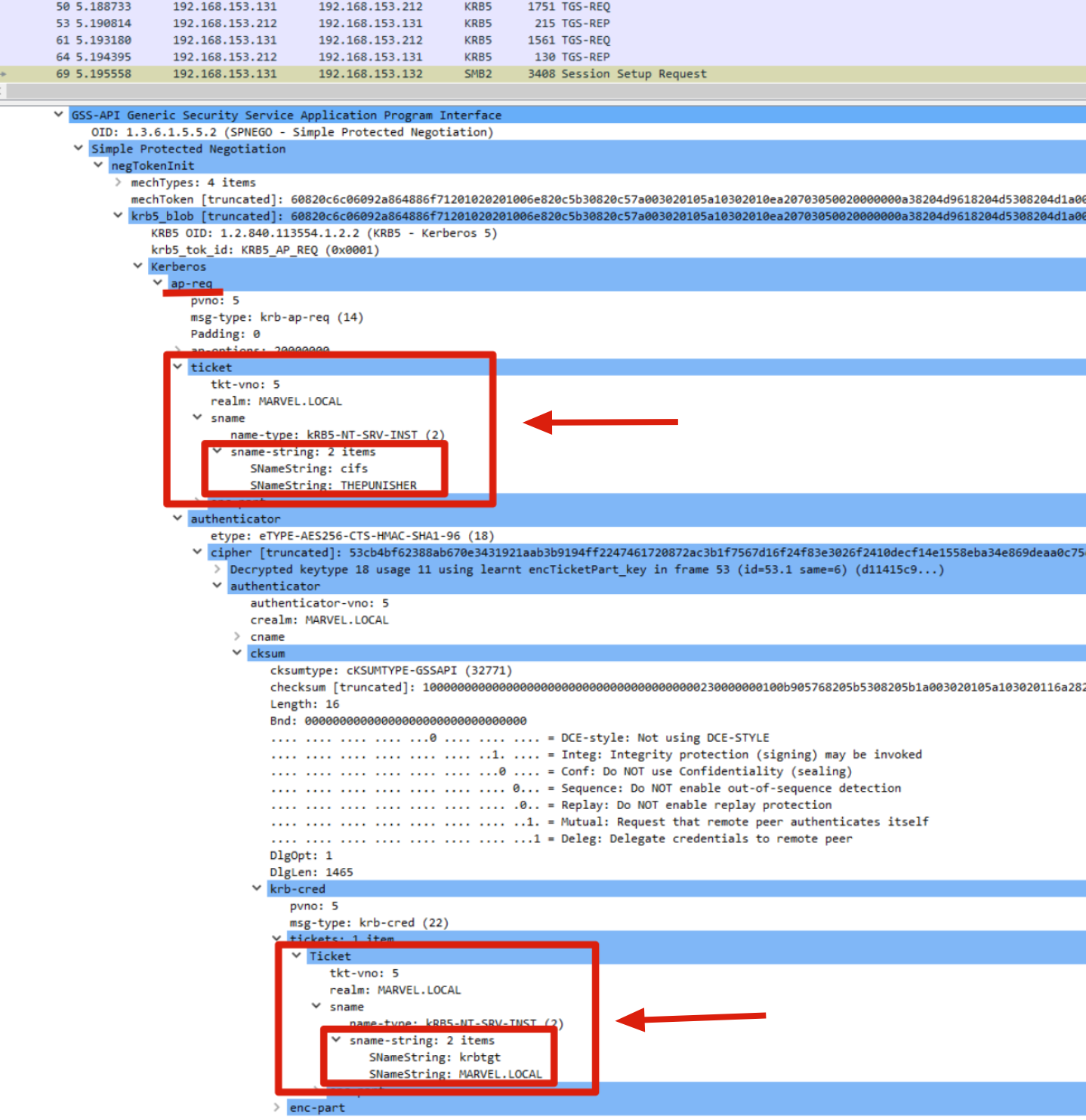 The Client, after the usual checks, in summary, sends a “KRB_AP_REQ” packet to the AP Front-End (in this case to the CIFS service hosted on the computer THEPUNISHER) containing: