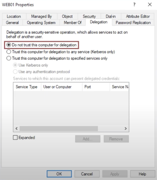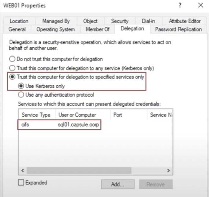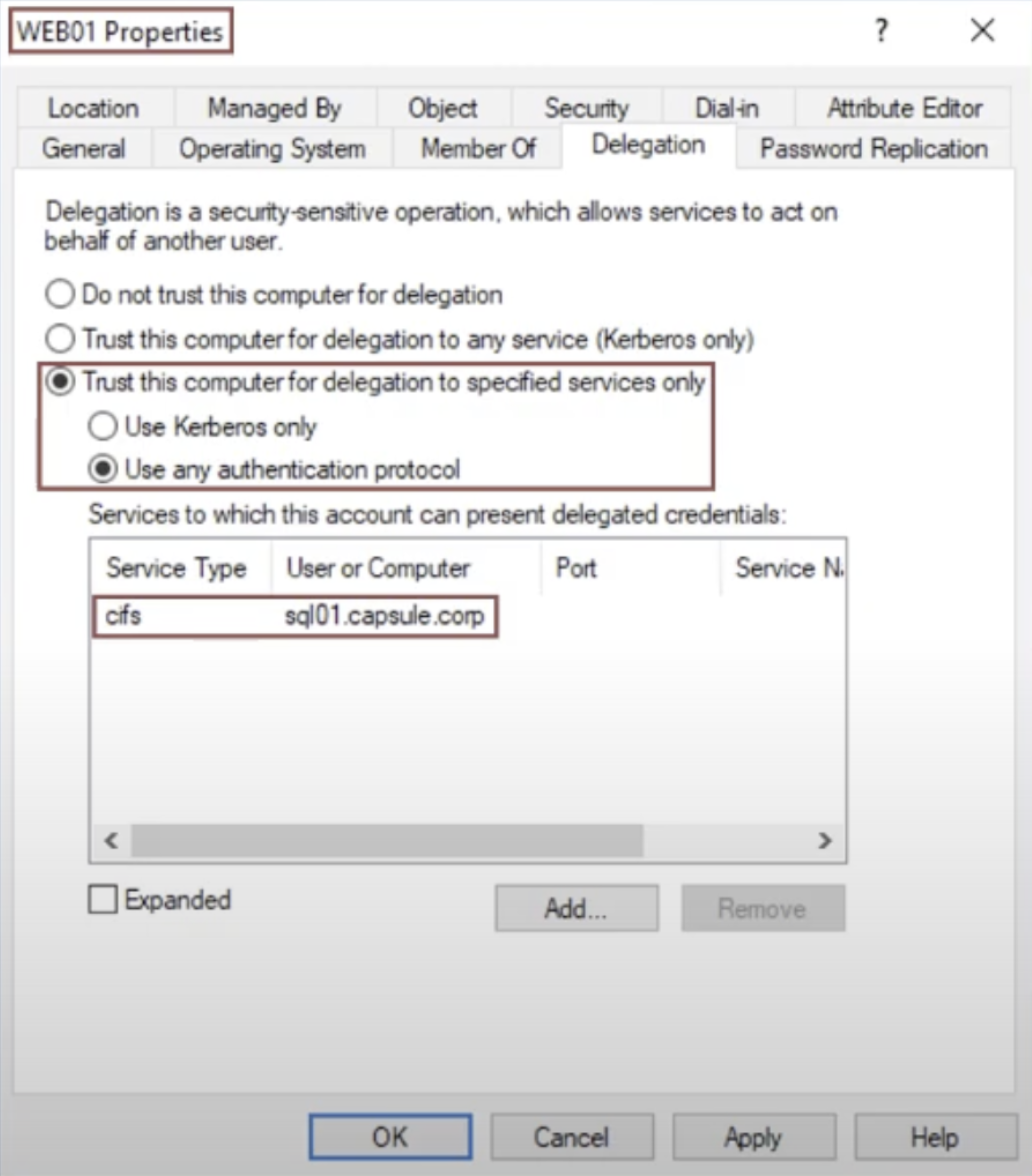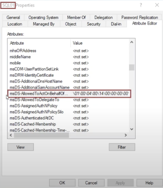 In our example the RBCD is configured on the Computer “SQL01” which will act as AP Back End, i want to highlight that this modification is actually reflected on the respective Computer Account since it is contained in the “Computer” object, so the Computer Account “SQL01$” will have the property “ms-DS-Allowed-To-Act-On-Behalf-Of-Other-Identity”, this means that any service started from that machine with the Service Account SQL01$ (Computer Account) will have the RBCD enabled (so, all services started with the Local Service account such as by default the CIFS service); in this example, the AP Back End (SQL01$) will authorize exclusively the AP Front End (WEB01$) to authenticate on behalf of the Client.