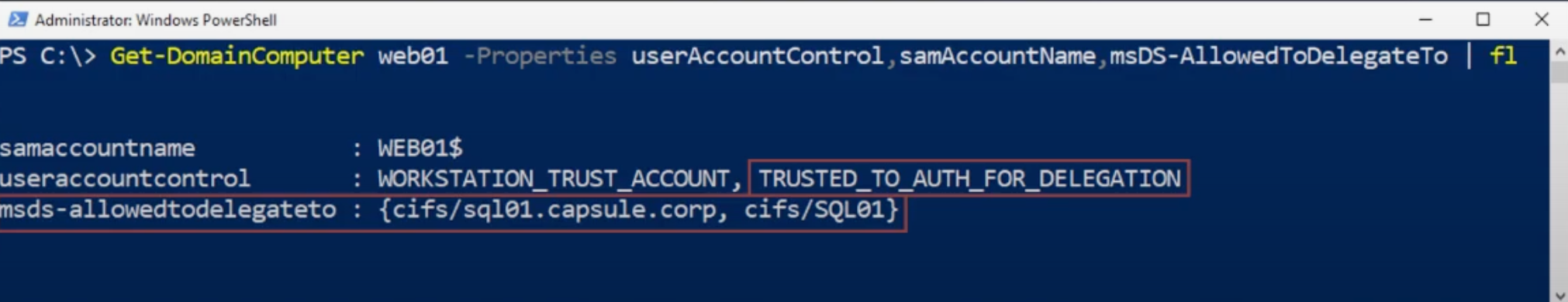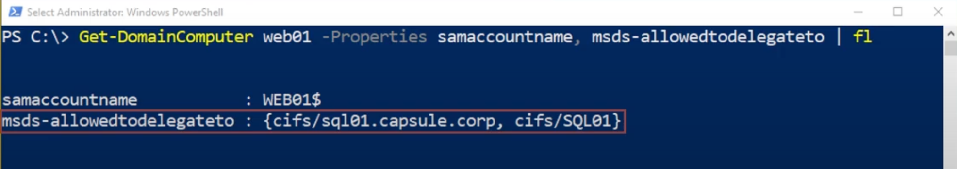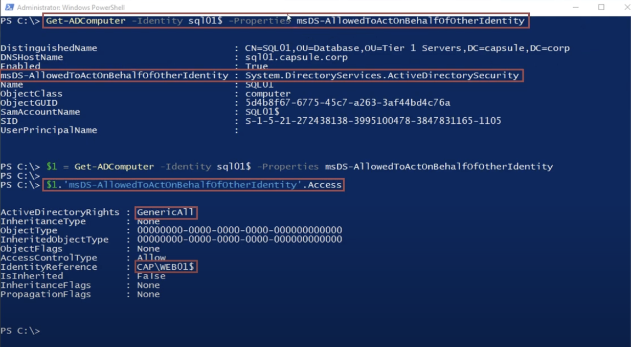 Finally, it is possible to inspect this attribute also via CLI using the commands shown in the screenshot, it can therefore be observed that the attribute “ms-DS-Allowed-To-Act-On-Behalf-Of-Other-Identity” of the Computer object SQL01 (similarly also the respective Computer Account SQL01$) contains the Computer object WEB01 (or rather its respective computer account WEB01$)