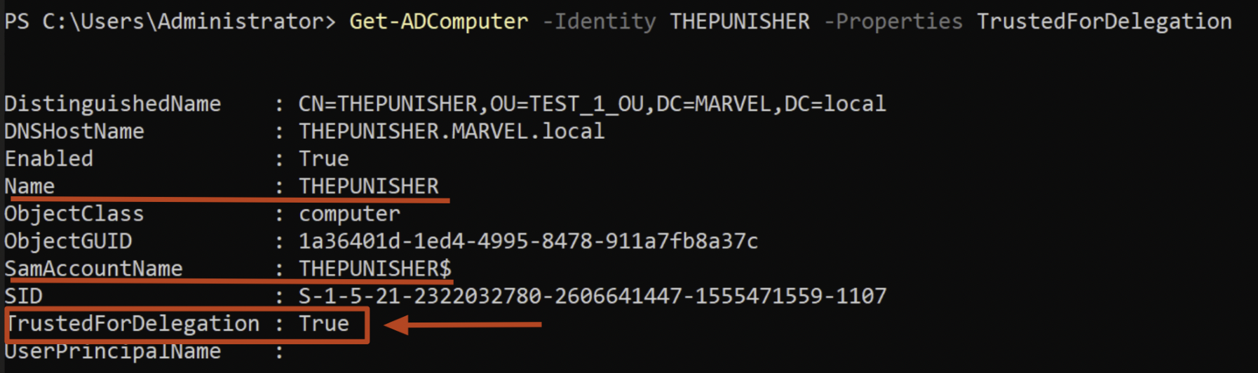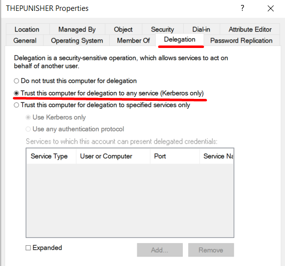 In our example the Kerberos Delegation is configured on the Computer “THEPUNISHER” which will act as the “Front-End” AP, this modification is actually reflected on the related Computer Account since it is contained in the “Computer” object (therefore the Computer Account THEPUNISHER$ will have the flag “TRUSTED_FOR_DELEGATION” set to “TRUE” / “1”), this means that any service started by this computer with the Service Account THEPUNISHER$ (Computer Account) will have the Kerberos Unconstrained Delegation enabled (so, all services started with the Local Service account such as by default the CIFS service).