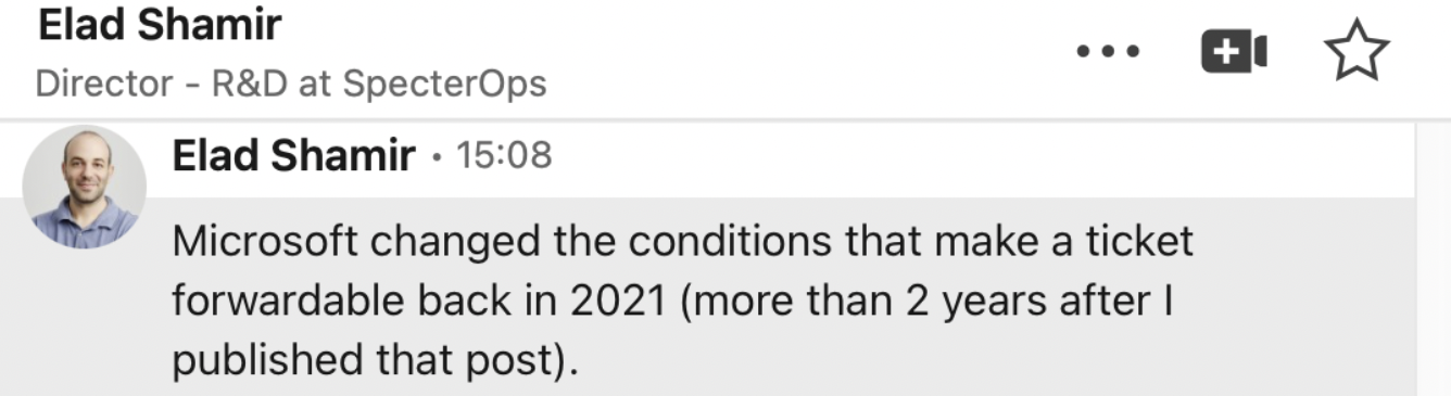 Furthermore, i want to highlight that this TGS Ticket issued through the RBCD will have the “Forwardable” flag set to “1”, meaning it will be valid and equivalent to any other TGS Ticket normally issued by the KDC.