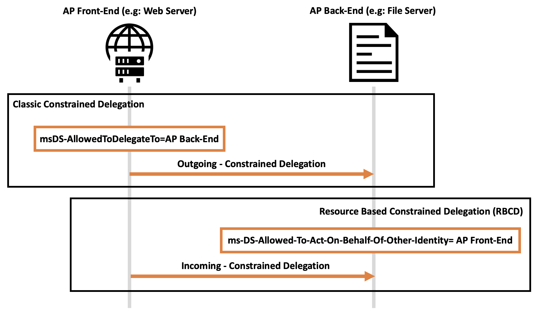 Below is a diagram that explains how “Constrained Delegation” can be defined as a so-called “Outgoing” Constrained Delegation, because the configuration is done on the AP Front End, while “RBCD” can instead be defined as a so-called “Incoming” Constrained Delegation, since the configuration is instead done on the AP Back-End.