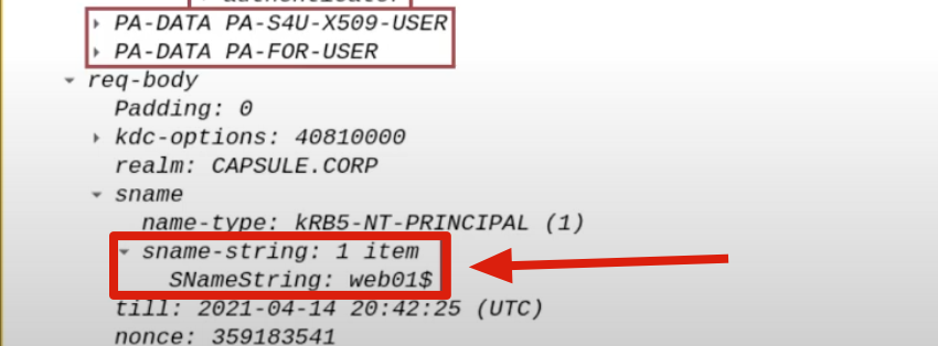 The TGS Ticket that the AP Front End previously received from the KDC using the “S4USelf” extension will be sent; it’s the evidence that the Client (ex CAPSULE.corp\vegeta) has successfully accessed the AP Front End (HTTP service on the WEB01 machine) (and that therefore the AP Front End can potentially impersonate the Client)