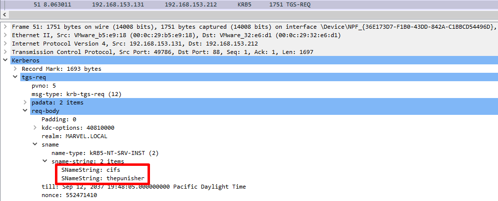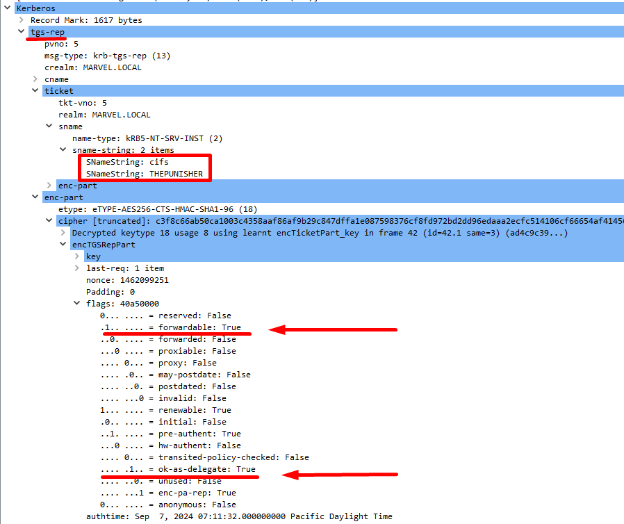 - Ticket TGS: The TGS Ticket for the AP “Front-End” (CIFS Service hosted on “THEPUNISHER”) BUT with the flag “OK-AS-DELEGATE” set to TRUE
