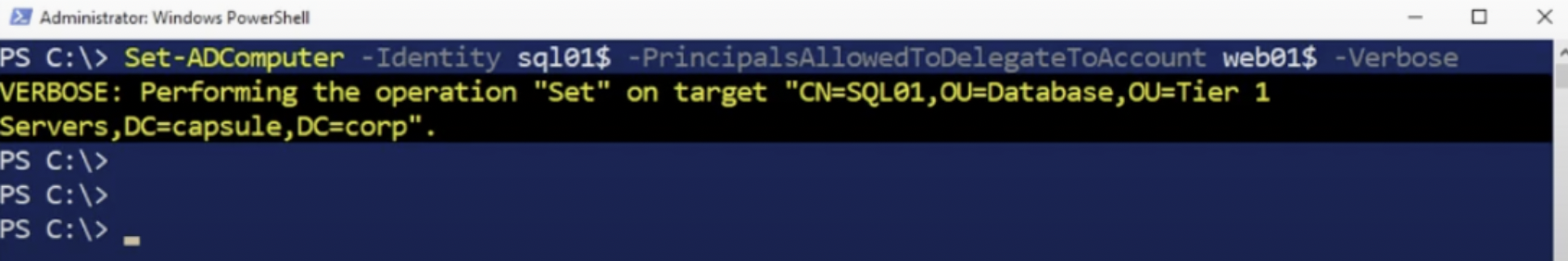 Finally, it is possible to inspect this attribute also via CLI using the commands shown in the screenshot, it can therefore be observed that the attribute “ms-DS-Allowed-To-Act-On-Behalf-Of-Other-Identity” of the Computer object SQL01 (similarly also the respective Computer Account SQL01$) contains the Computer object WEB01 (or rather its respective computer account WEB01$)