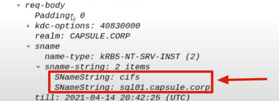 The SPN related to / pointing to the Back-End service that the Front-End service needs to connect to on behalf of the Client is sent in plain-text, in this case it refers to the AP Back-End identified by the SPN “CIFS/SQL01”, that is, the CIFS service present on the “SQL01” machine.