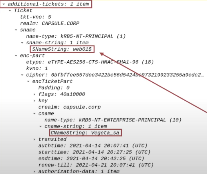 This TGS Ticket belonging to the Client (ex CAPSULE.corp\vegeta) valid for the AP Front End (ex HTTP) will be used exclusively by the AP Front End as “evidence” to subsequently invoke the S4U2Proxy extension.
