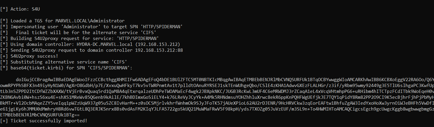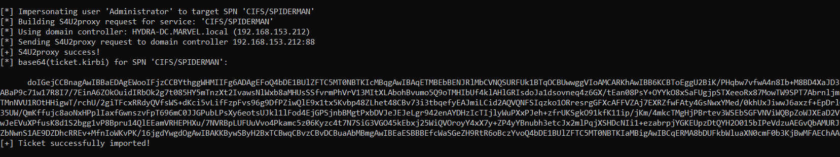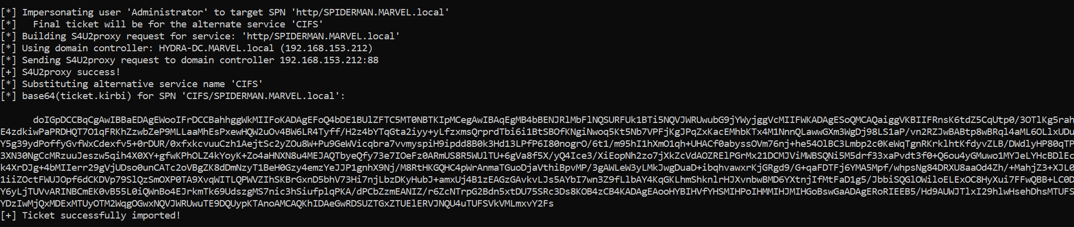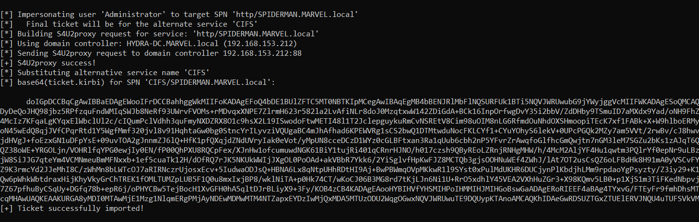 Finally, Rubeus will modify the SPN field of the received TGS Ticket, replacing the HTTP service with the desired CIFS service, in this way the output TGS Ticket (belonging to the user MARVEL\Administrator) will have the SPN “CIFS/SPIDERMAN” and will therefore be valid for the CIFS service exposed on the SPIDERMAN machine, after this Rubeus imports this Kerberos Ticket into memory.