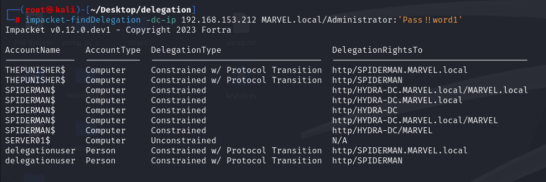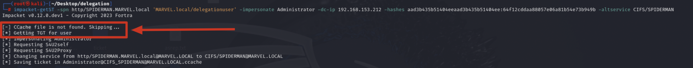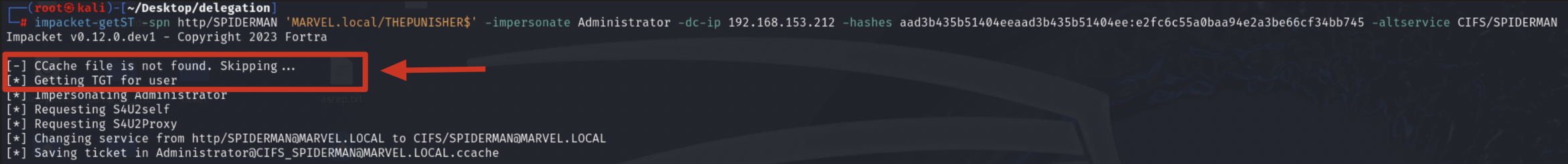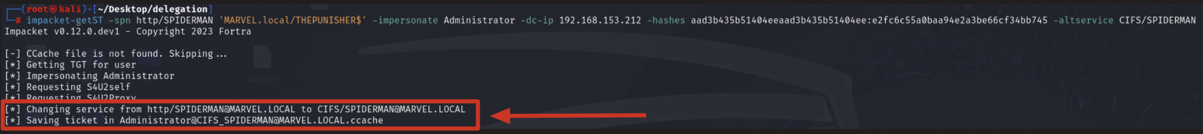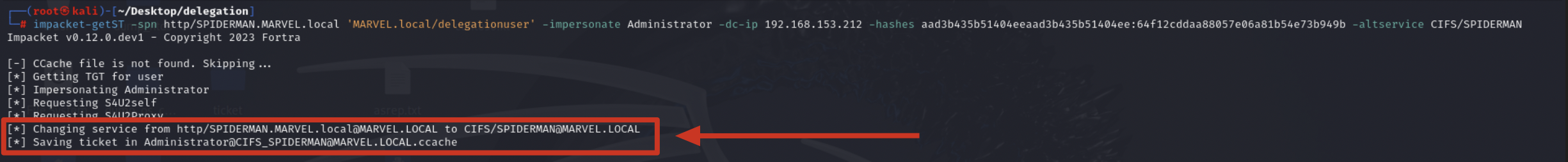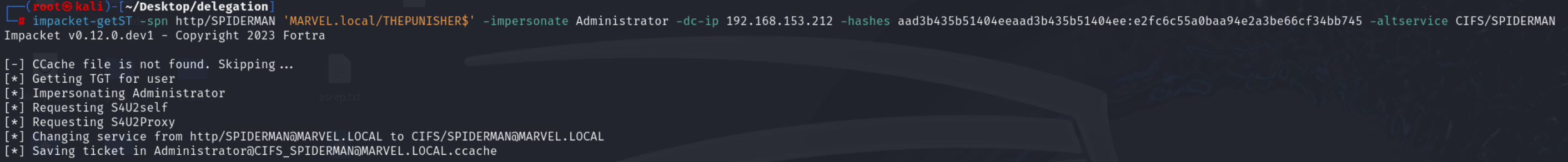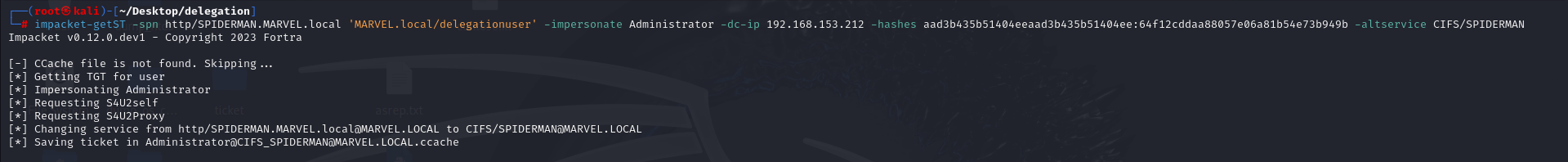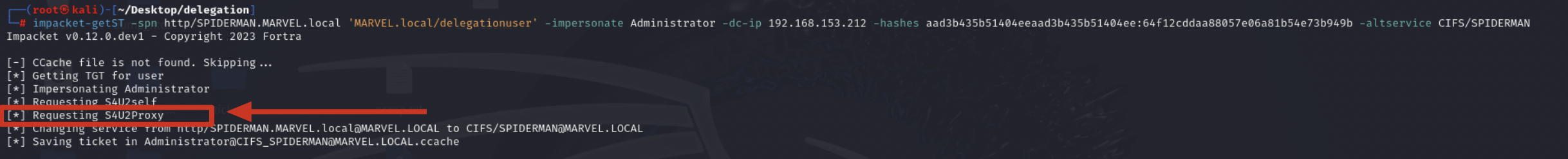 If the attacker does NOT want to replace the service of the TGS Ticket obtained via S4UProxy, they will simply NOT insert the “altservice” parameter, consequently, in this context we will obtain a TGS Ticket (belonging to the user MARVEL\Administrator) valid for the HTTP service present on the SPIDERMAN machine (usefull for a potential WinRM Service running and present on the SPIDERMAN machine).