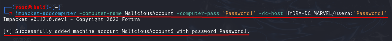 As you can see, following the command a new arbitrary Computer Account has been created.