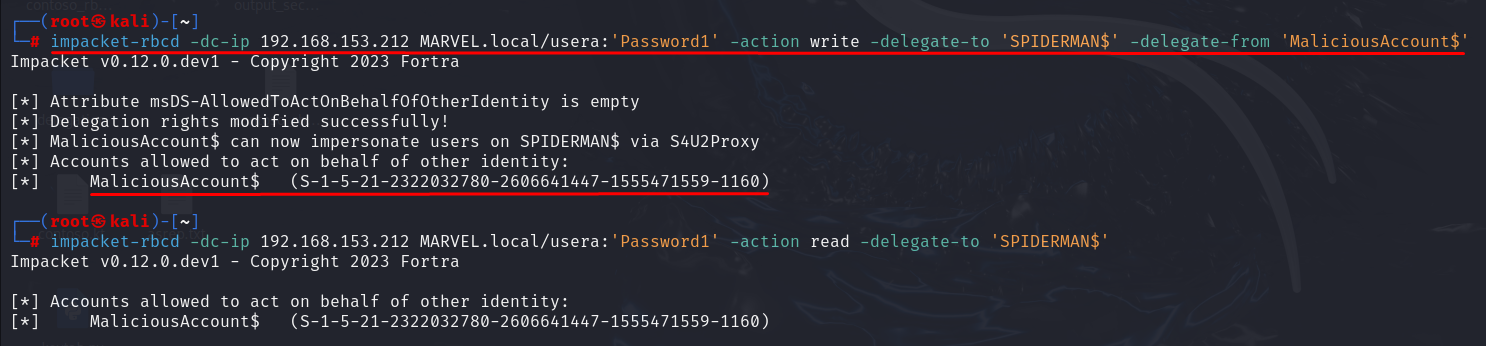 The attacker, impersonating the user “MARVEL\userz” populates their “msDS-AllowedToActOnBehalfOfOtherIdentity” attribute with the value of the Computer Account “EvilComputer$” previously created, in this way the attacker has forced a malicious Self RBCD.