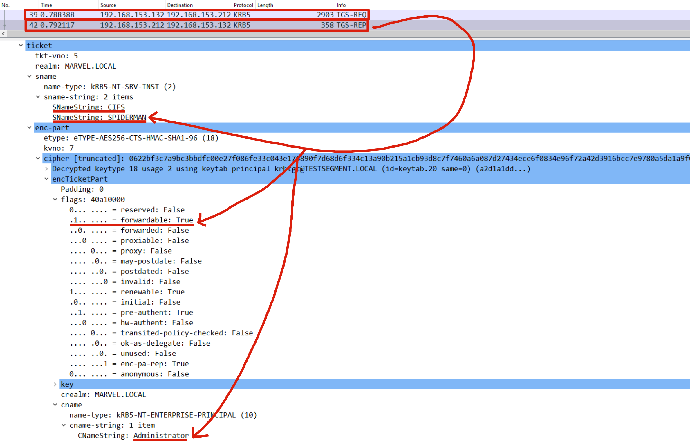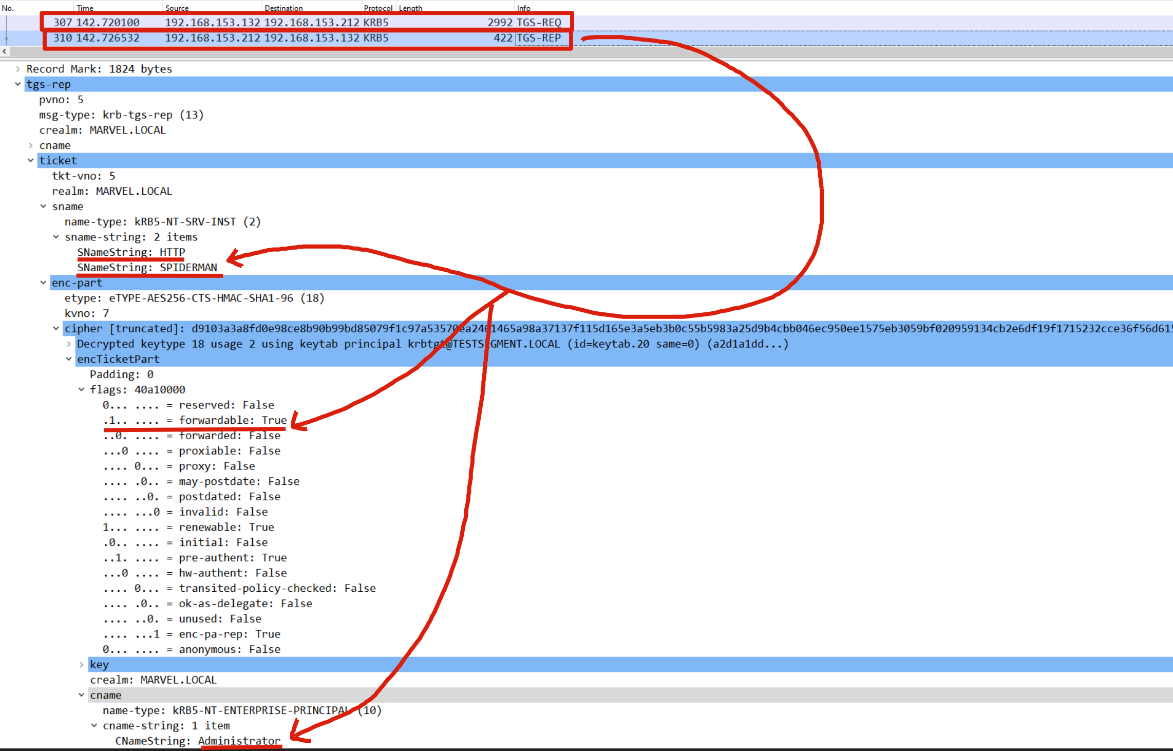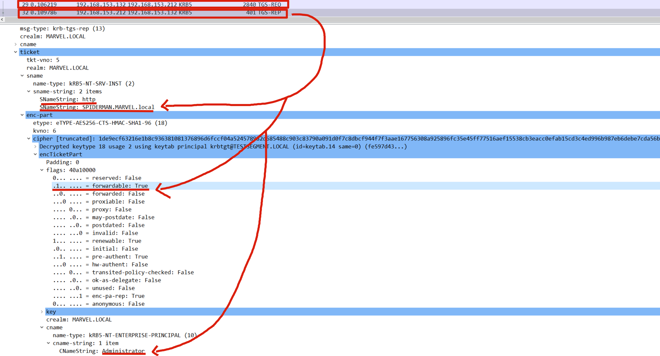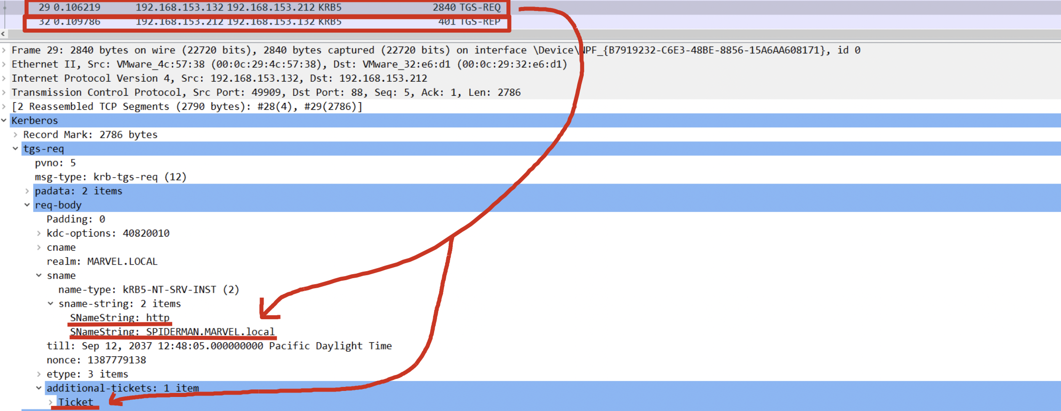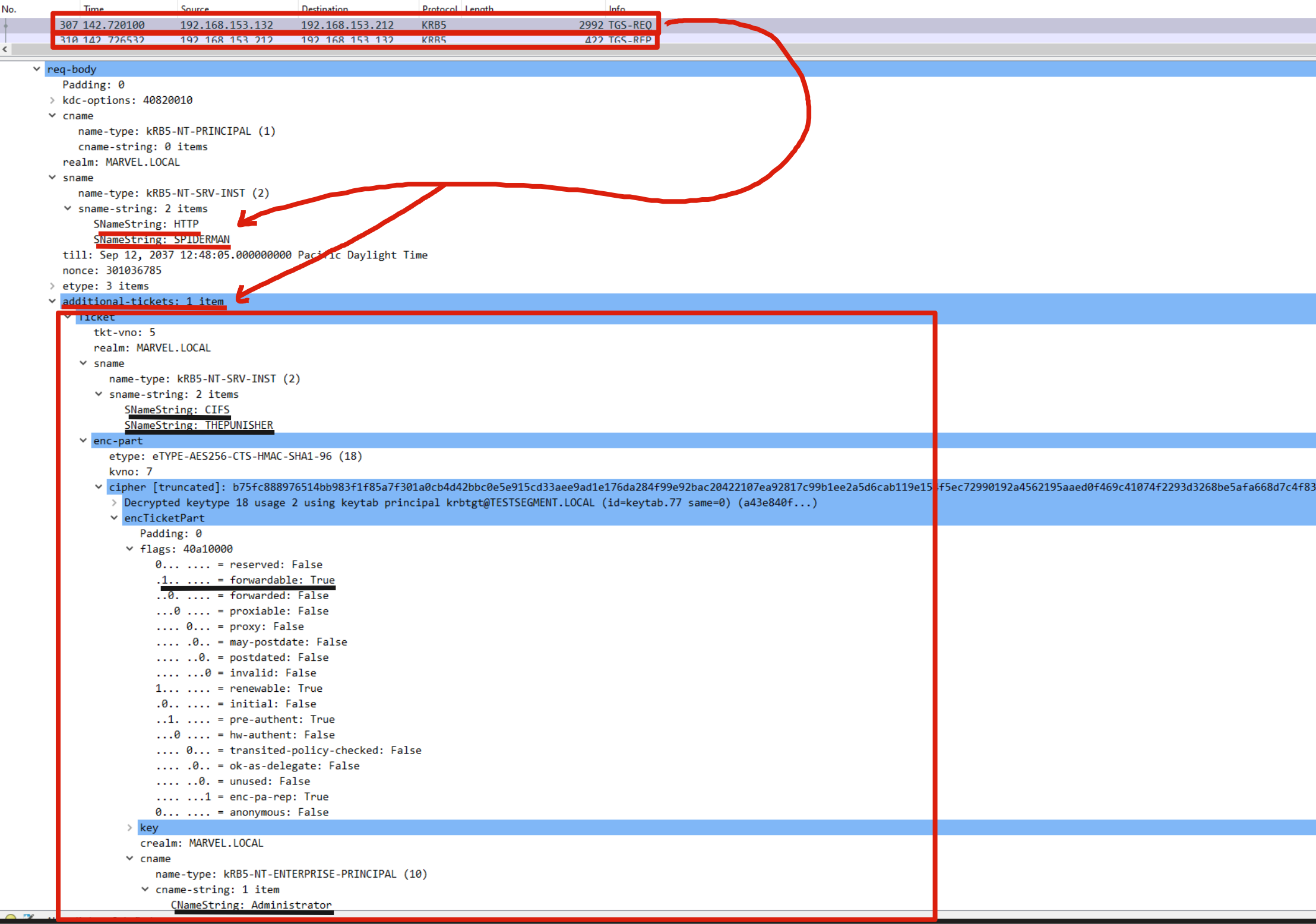 As we can see, Rubeus sends a “KRB_TGS_REQ (S4UProxy)”, analyzing the content of the packet it can be noted that: 1) Inside the “Additional Ticket” field the TGS Ticket previously received in the “S4UProxy Response” is indeed sent (so the Ticket inserted by the attacker in the /ticket parameter) 2) The SPN that points to the service the compromised machine (Computer Account THEPUNISHER$) is authorized to access on behalf of the Client (indicated in the “msds-allowedtodelegateto” flag (1, 2), in fact the SPN “HTTP/SPIDERMAN.MARVEL.local” is present.