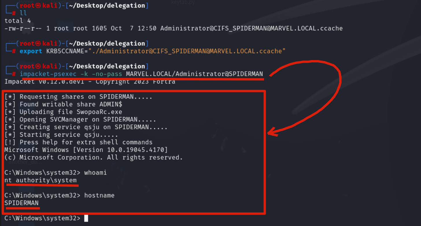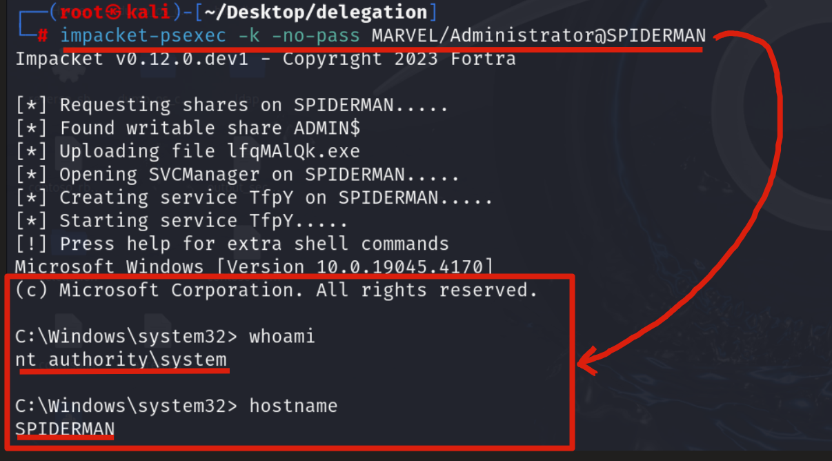 If you encounter an authentication error, try re-running the command by inserting the “msdsspn” parameter with a value that does not have the domain suffix, changing from “SPIDERMAN.MARVEL.local” to “SPIDERMAN”; in both cases it should still work since both values are present within the msds-allowedtodelegateto property; also make sure to use the same domain notation in “msdsspn” as in the PsExec command (in this case), so if, for example, I request a TGS Ticket to access the SPIDERMAN.MARVEL.local machine, use the same wording to connect via PsExec.