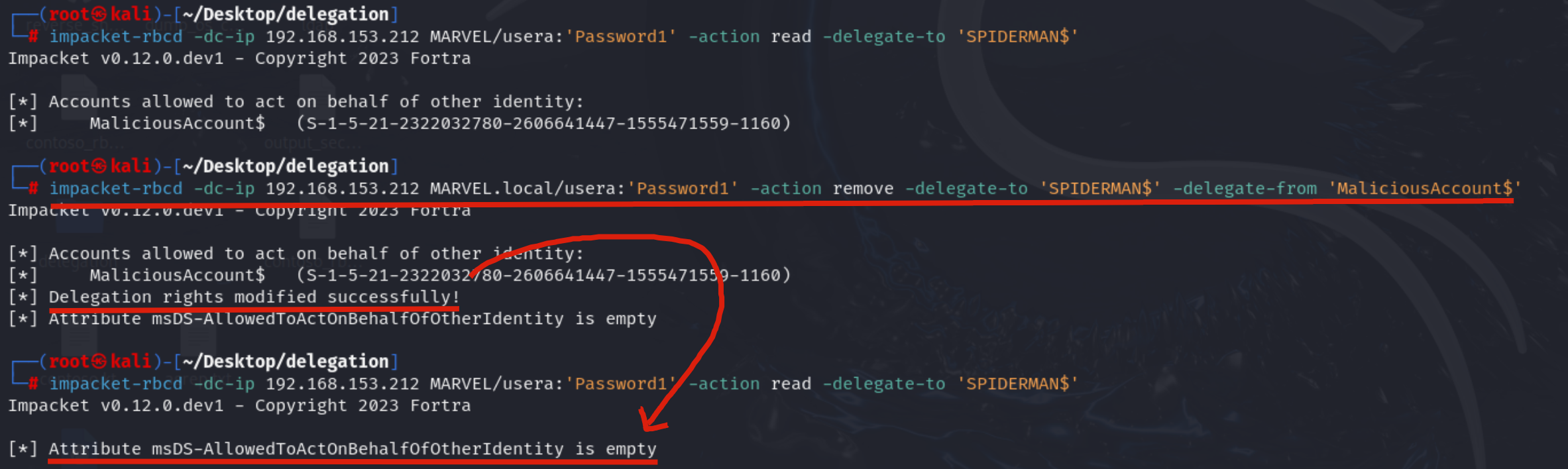- (2 & 3) For simplicity, we do not show points 2 (Compromise of the Service Account MARVEL\userz) and 3 (the attacker creates a Computer Account within the domain, in this example we will use the EvilComputer$ user created previously)