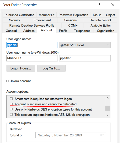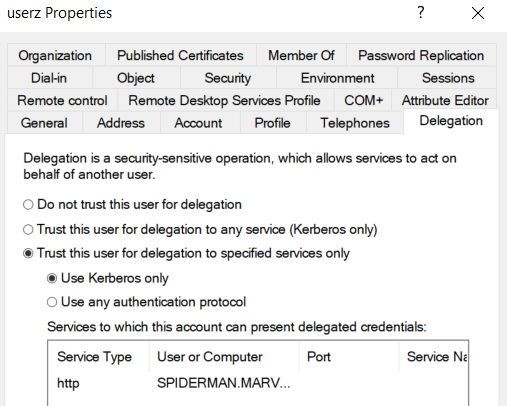 In fact, inspecting via ADUC the “Delegation” tab of the domain user “MARVEL\userz” we will find this configuration.