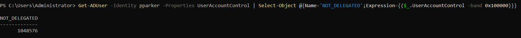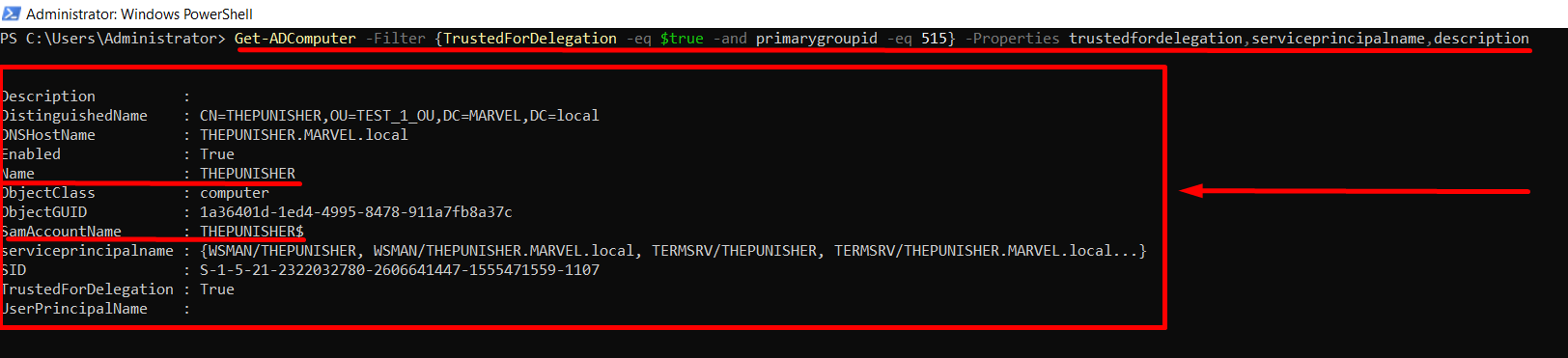 To identify whether Unconstrained Delegation is enabled within the domain, it is necessary to verify which AD objects have the “TRUSTED_FOR_DELEGATION” flag set to “TRUE” / “1” within their “UserAccountControl” property, to do this in Windows we can for example use “Get-ADComputer”.