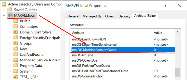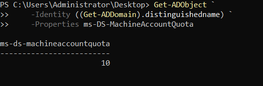PS C:\> Get-ADObject ` -Identity ((Get-ADDomain).distinguishedname) ` -Properties ms-DS-MachineAccountQuo