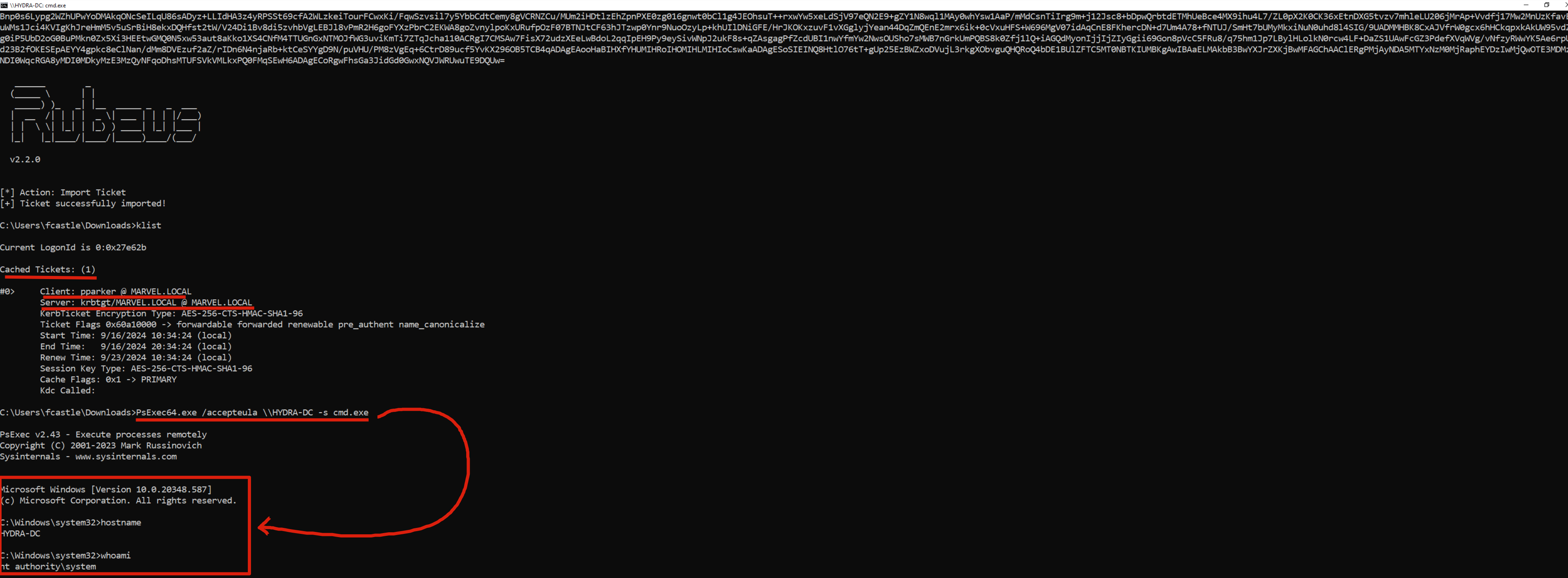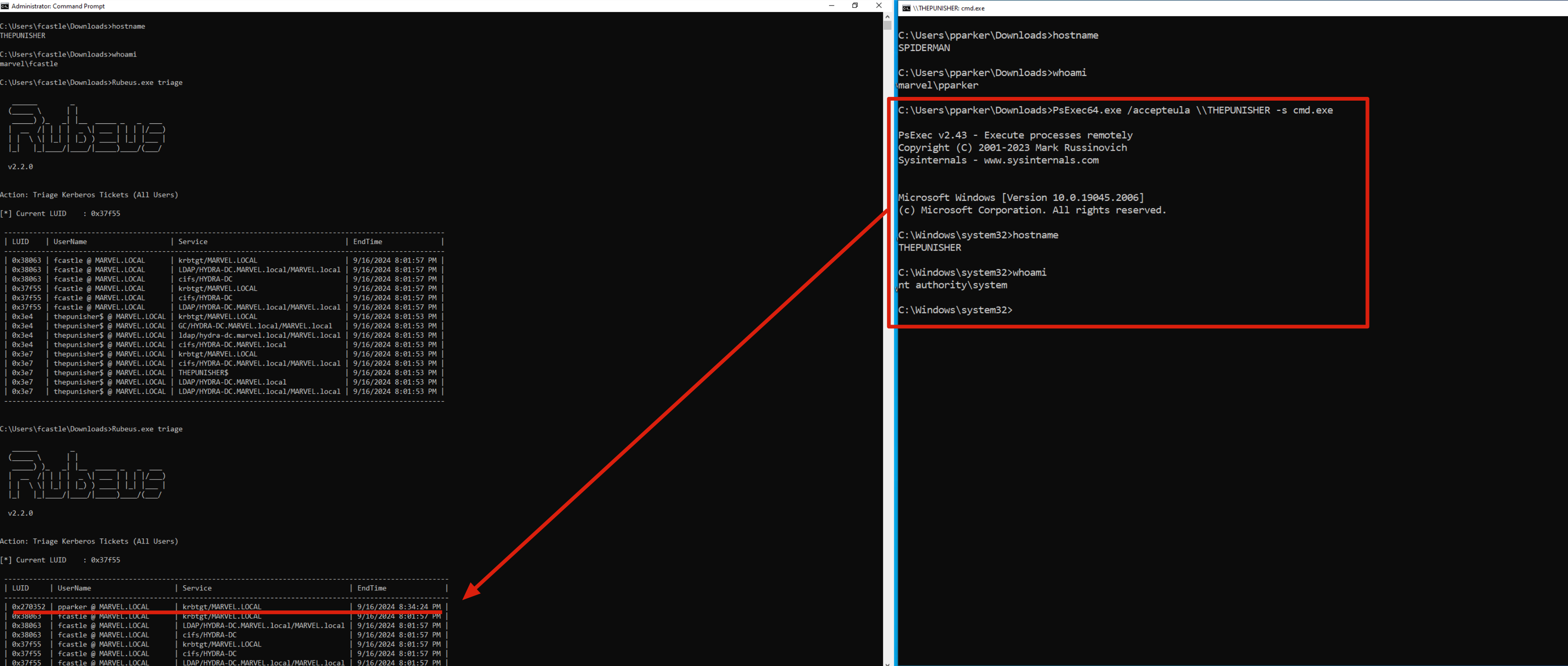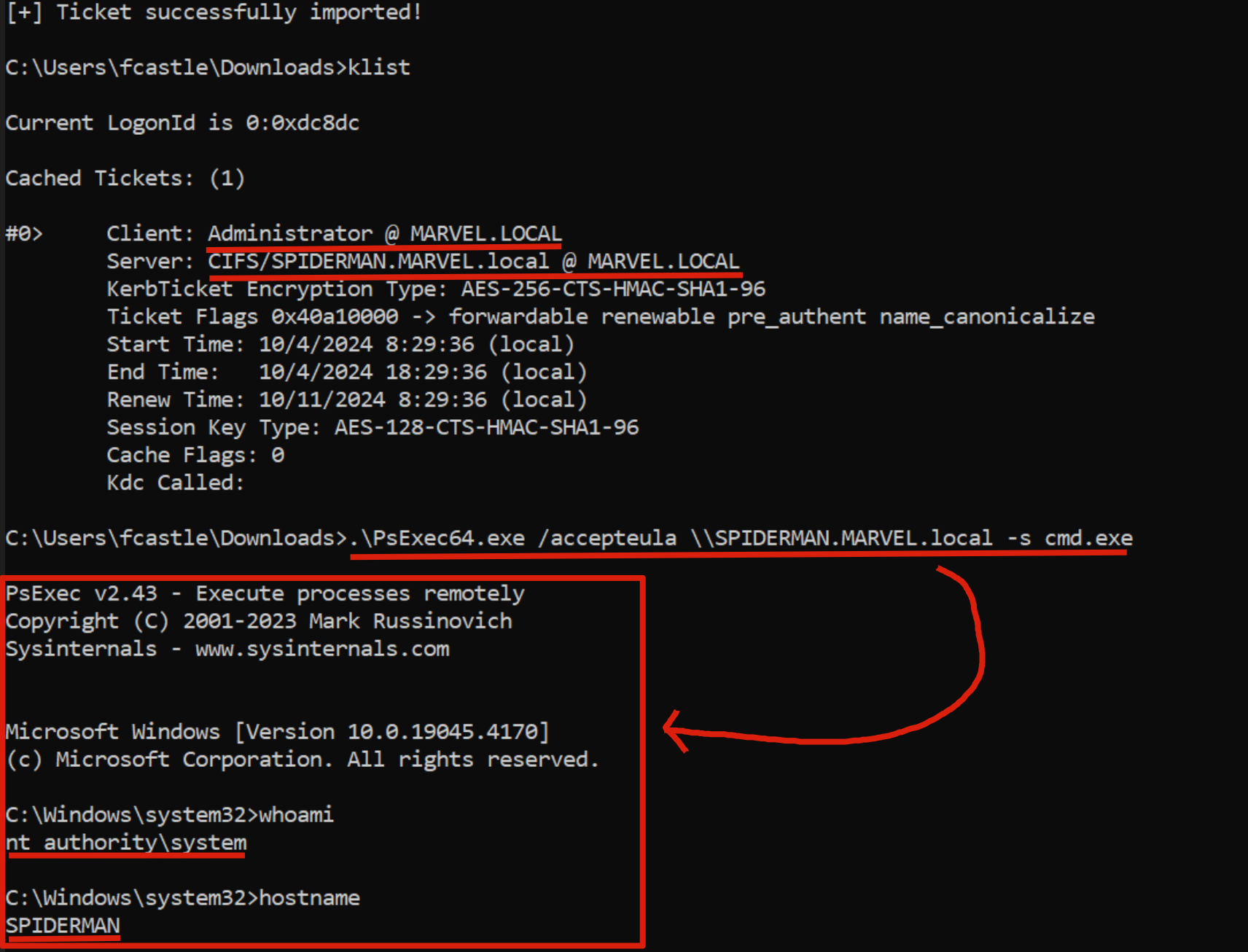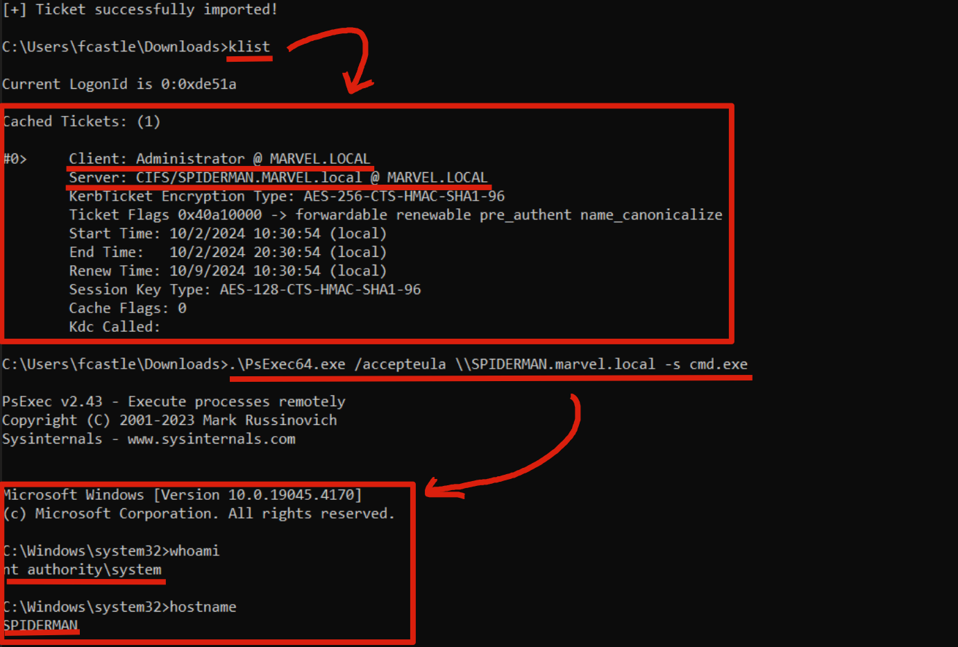 As you can notice, following the Rubeus command we will have cached in memory a TGS Ticket belonging to the user “Administrator” valid for the CIFS service of the machine SPIDERMAN, in fact, performing a Network Logon with “PsExec” the OS will retrieve the cached TGS Ticket and use it to perform the authentication; in this way the attacker has managed to authenticate with administrative permissions to the machine SPIDERMAN.