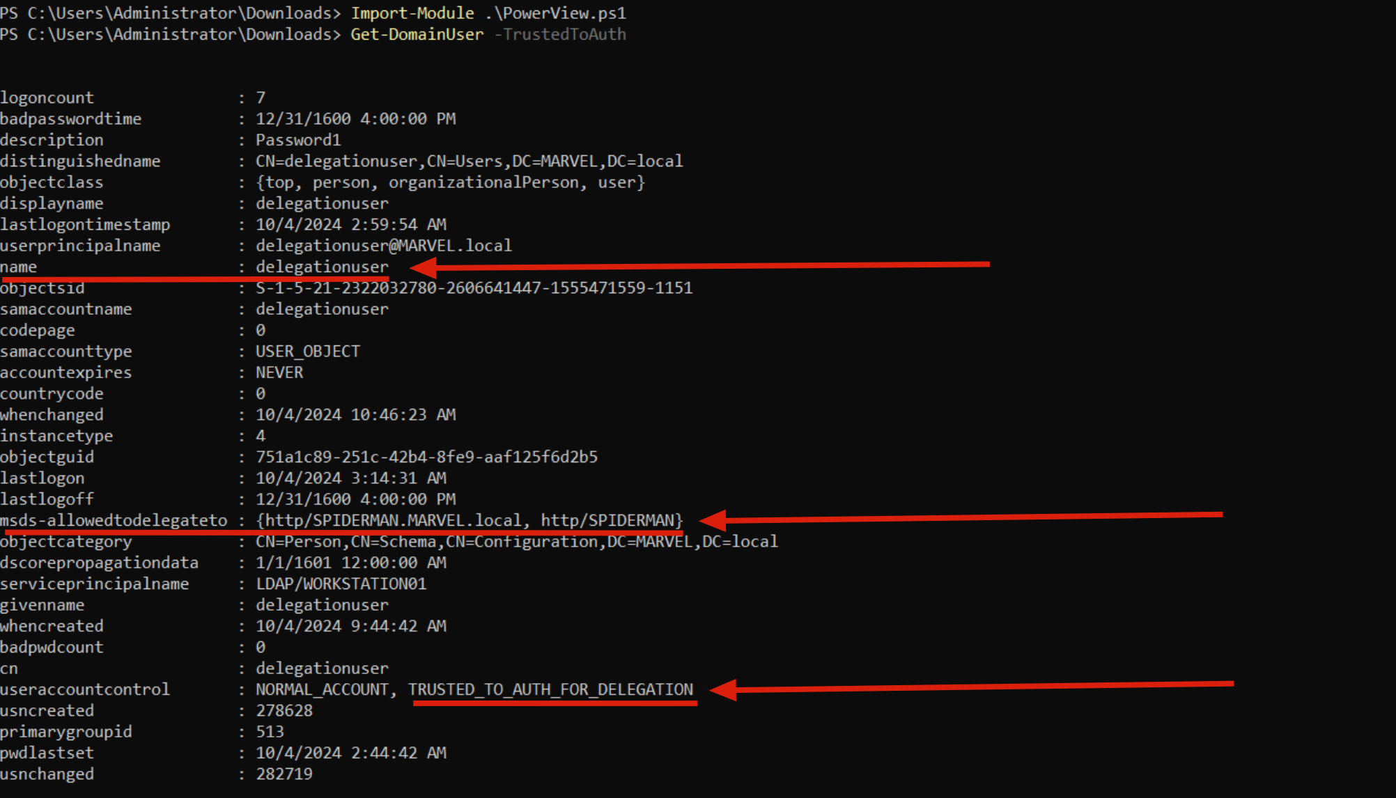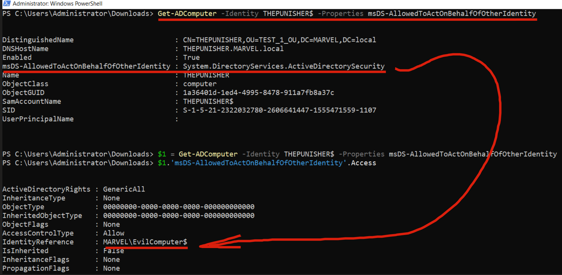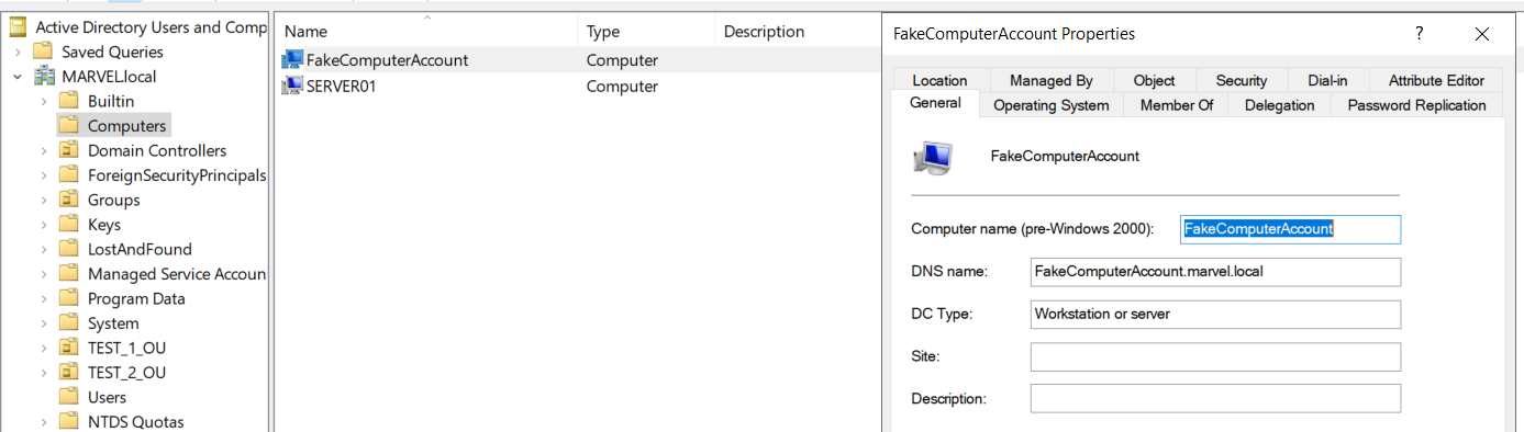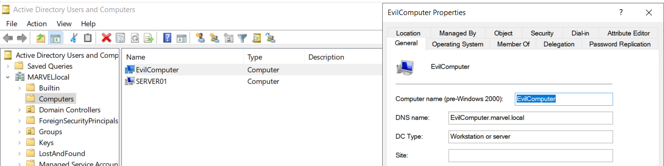 via “Get-ADComputer” (requires RSAT) it is noticeable that the value “MARVEL\EvilComputer$” is actually present.