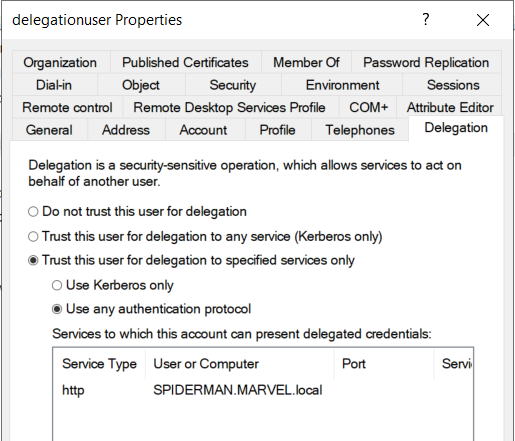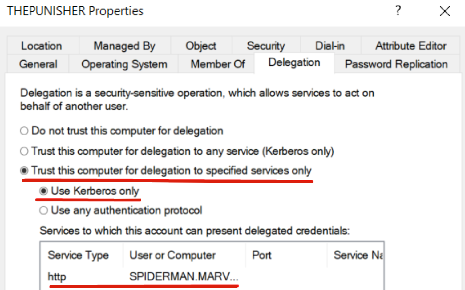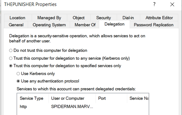 As you can notice, the Computer Account THEPUNISHER$ has Constrained Delegation (Kerberos Only) enabled; specifically, this account and therefore ALL services running under it will be able to authenticate on behalf of the Client exclusively to the SPN “HTTP/SPIDERMAN”, so the HTTP service of the SPIDERMAN machine.