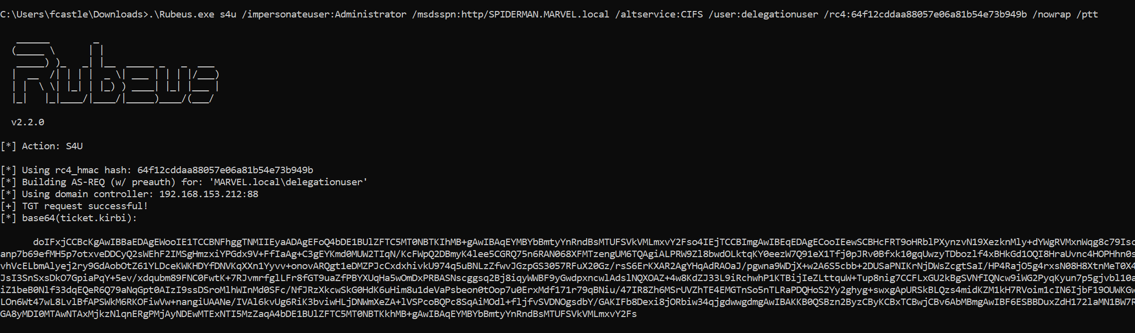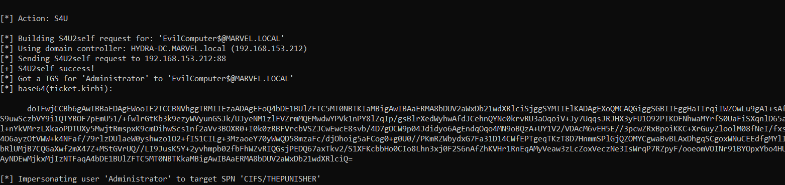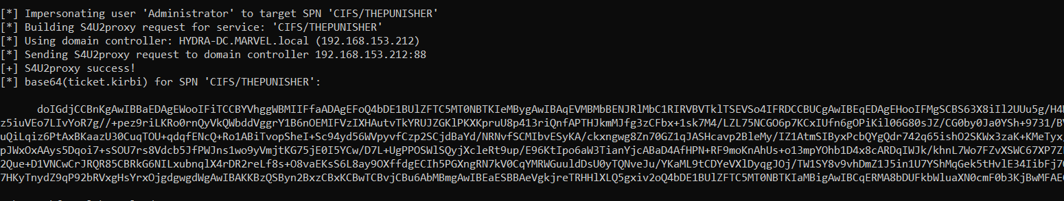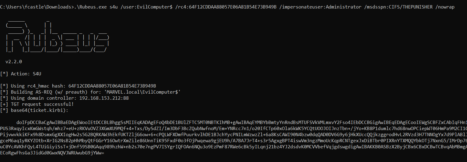 C:\> .\Rubeus.exe s4u /user:<Created_Computer_Account> /rc4:<Created_Computer_Account_RC4Key> /impersonateuser:<User_To_Impersonate> /msdsspn:<Desired_SPN_related_to_the_ComputerAccount_with_RBCD_configurated> /nowrapUnlike in the Abuse Protocol Transition context where the “/msdsspn” parameter was populated exclusively with the SPN present in the “msds-allowedtodelegateto” property, in the Abuse Kerberos Only context it must be populated with any arbitrary SPN chosen by the attacker that has the THEPUNISHER$ Computer Account as its Service Account (for example CIFS/THEPUNISHER), everything will work because the KDC will use the RBCD previously configured.