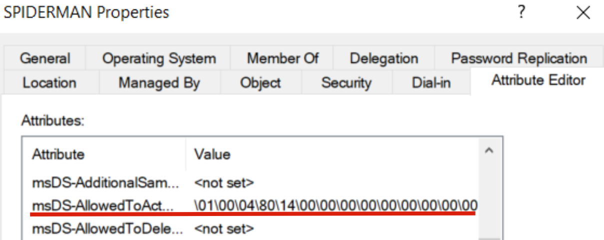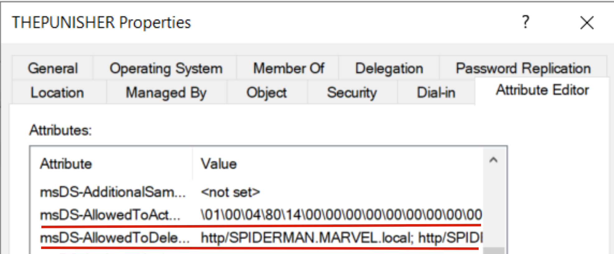 Indeed, if we now inspect the “msDS-AllowedToActOnBehalfOfOtherIdentity” attribute of the THEPUNISHER machine we can see that: