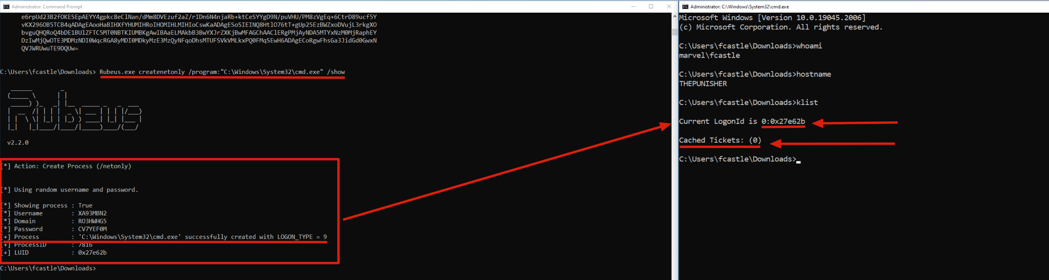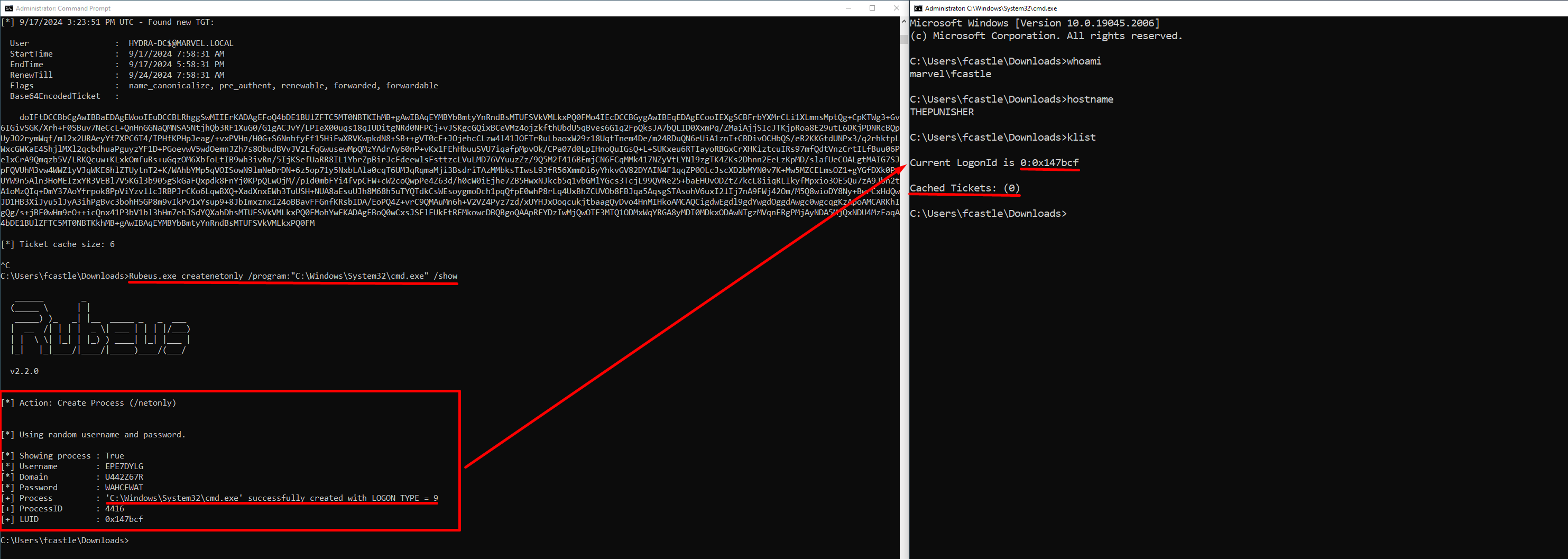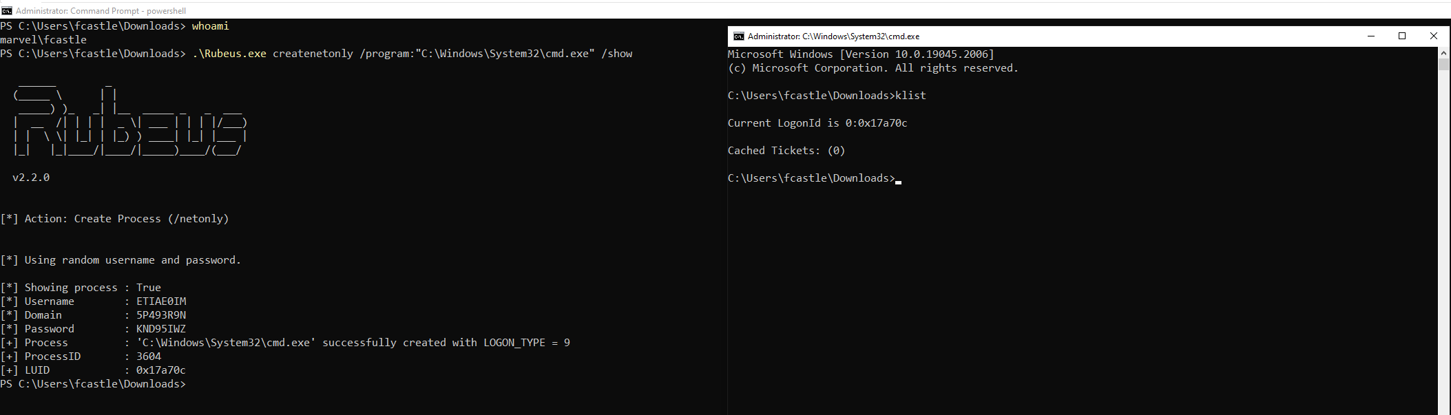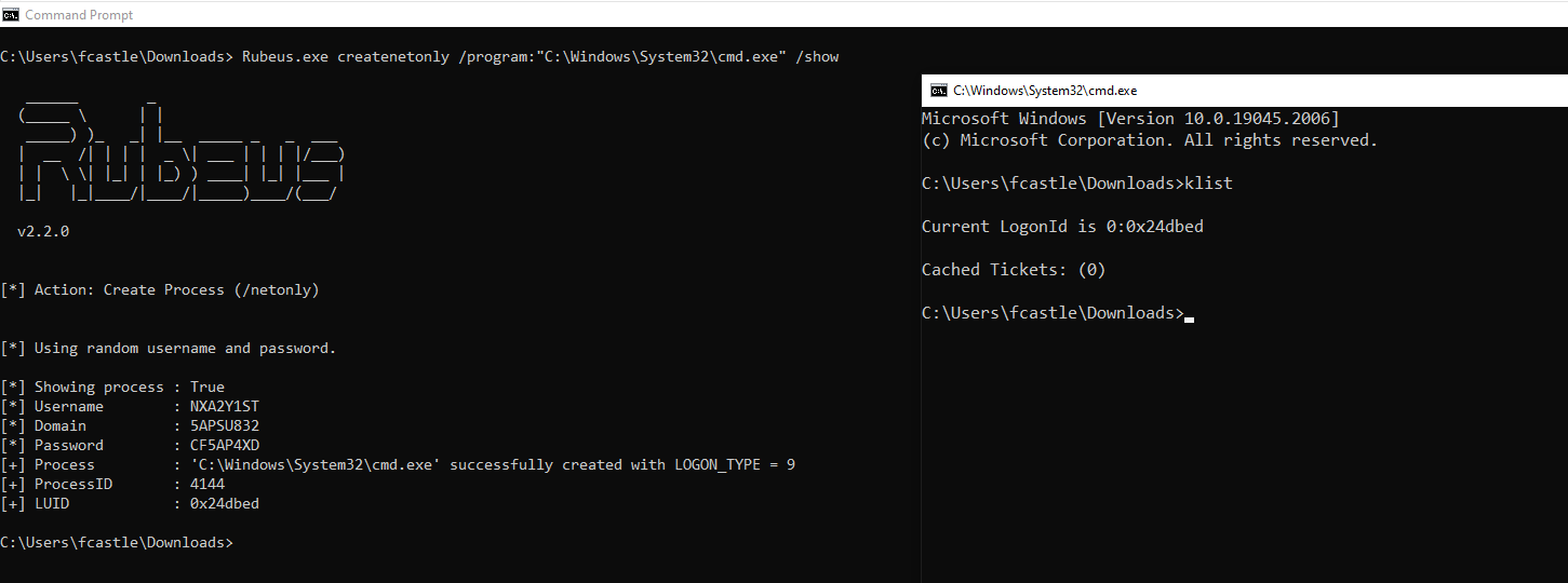 C:> Rubeus.exe createnetonly /program:"C:\Windows\System32\cmd.exe" /show