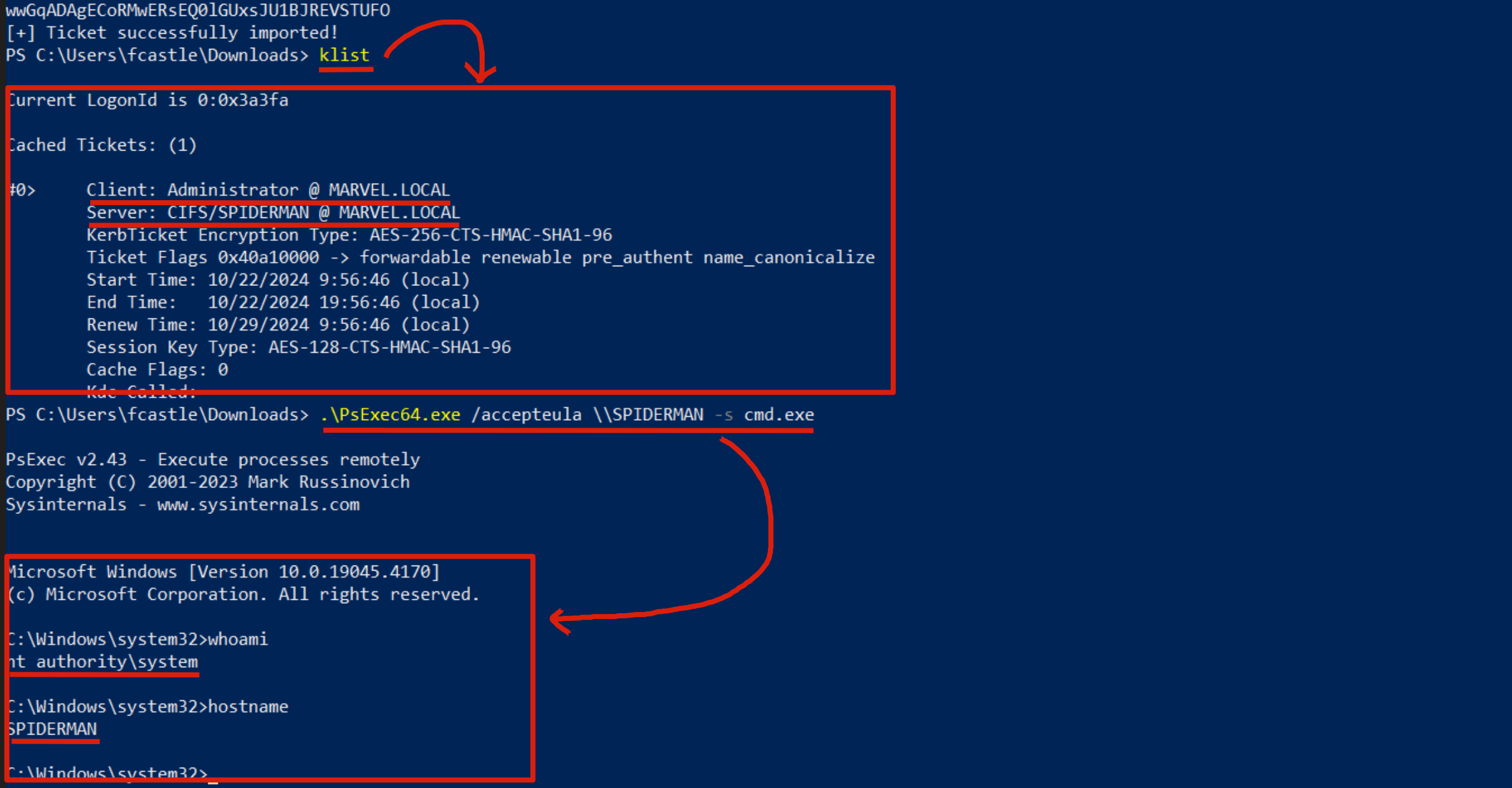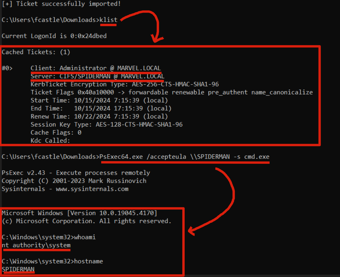 As you can see, following the Rubeus command we will have cached in memory a TGS Ticket belonging to the “Administrator” user valid for the CIFS service of the SPIDERMAN machine, in fact, performing a Network Logon with “PsExec” the OS will retrieve the cached TGS Ticket and use it to authenticate; in this way the attacker has managed to authenticate with administrative privileges to the SPIDERMAN machine.