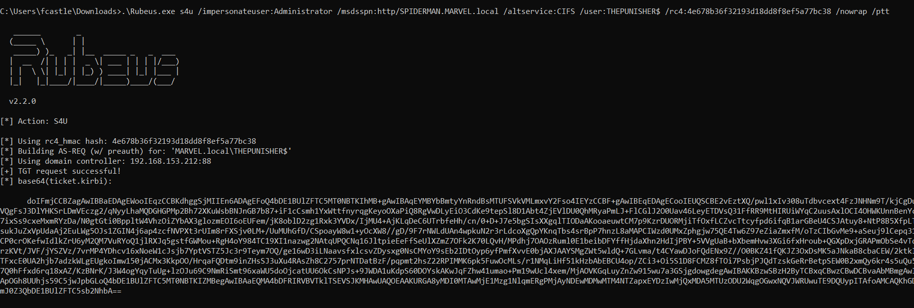 To do this in a Windows context, it is necessary to perform this action having imported the TGT Ticket of the THEPUNISHER$ Computer Account into memory (in order to impersonate it); consequently, to avoid DoS we invoke a Sacrificial Process.