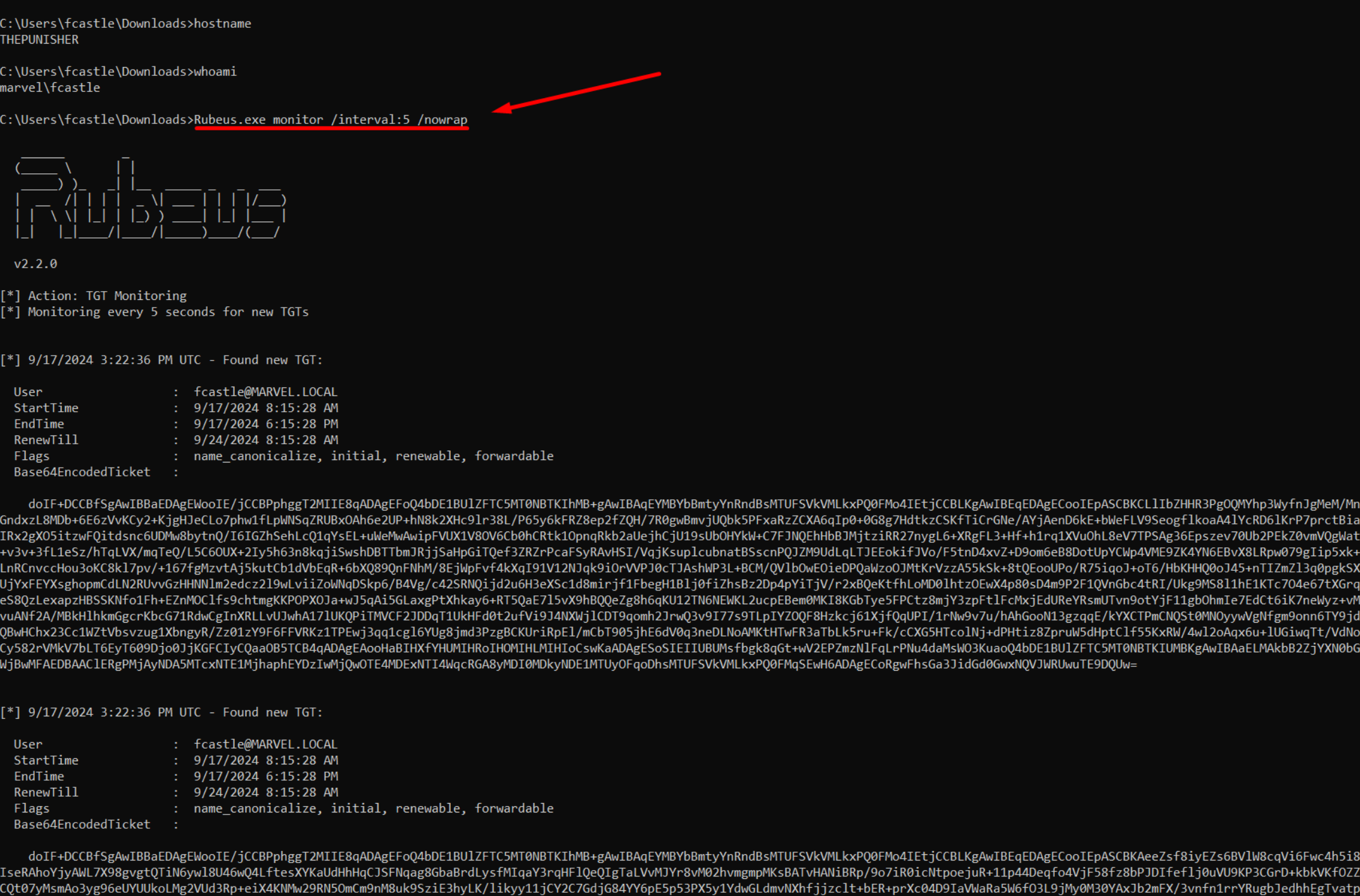 Specifically the “interval” parameter specifies how often every certain amount of time it must print on screen the new TGTs captured, while “nowrap” will print the Base64Encoded TTs without newlines.