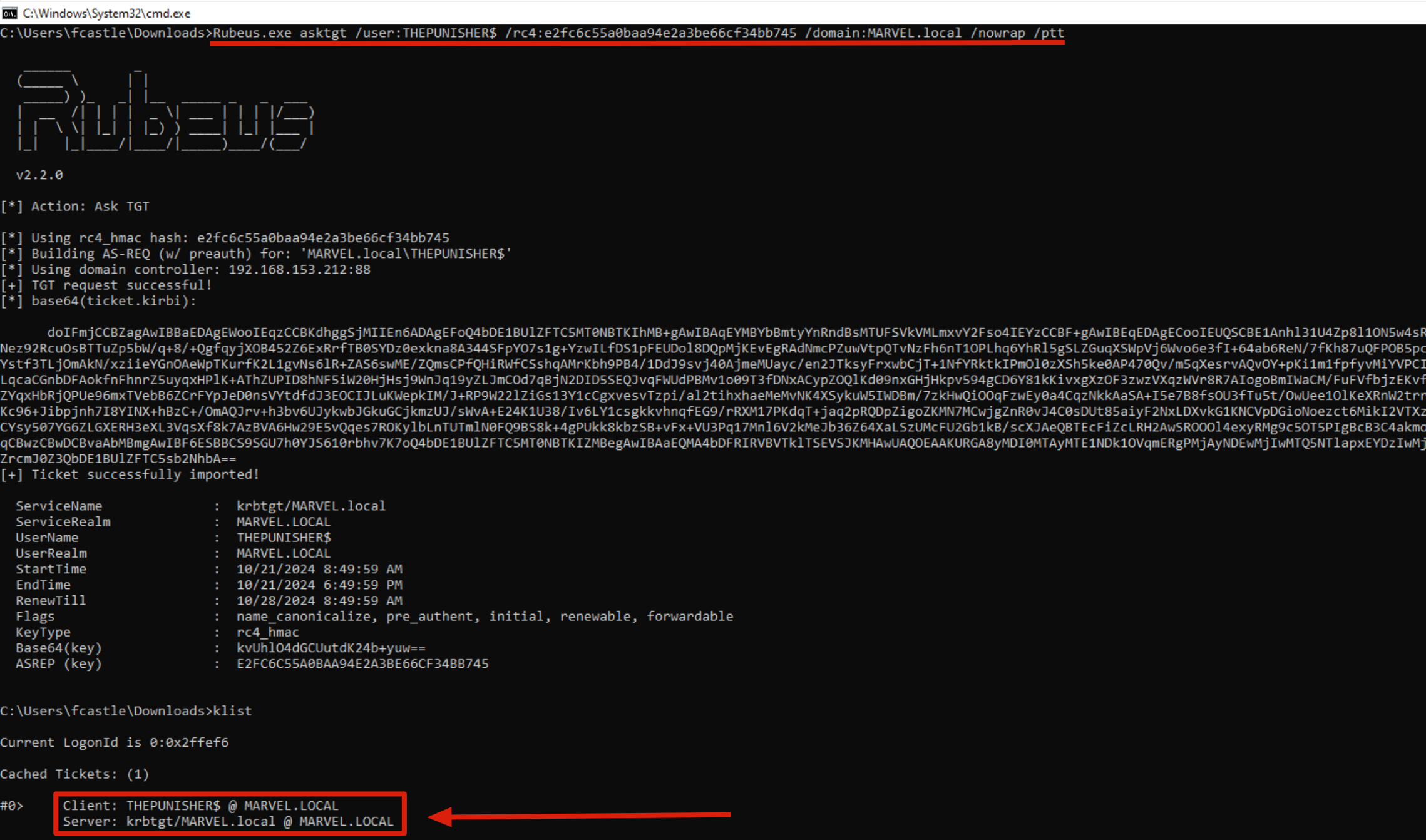 Then we execute the following Rubeus command within the Sacrificial Process which will retrieve and cache locally a Ticket TGT of the THEPUNISHER$ users.