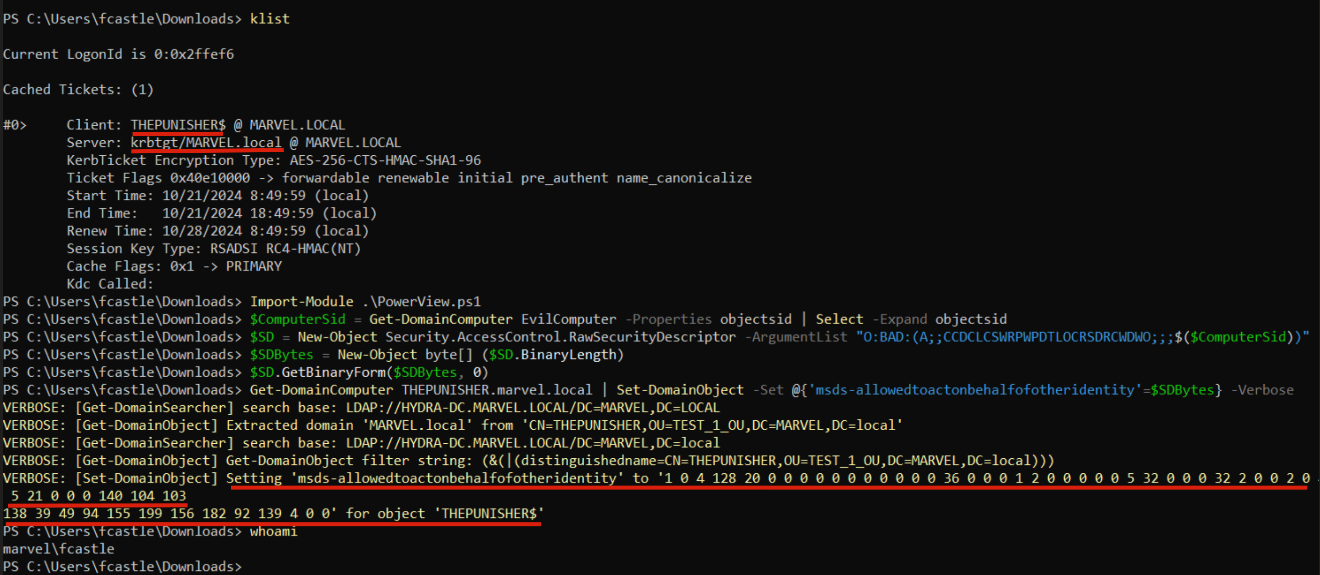 The attacker, impersonating the user “THEPUNISHER$” (Service Account with Constrained Delegation -Kerberos Only), populates their own “msDS-AllowedToActOnBehalfOfOtherIdentity” attribute with the value of the “EvilComputer$” Computer Account previously created; in this way, the attacker has forced a malicious Self RBCD.