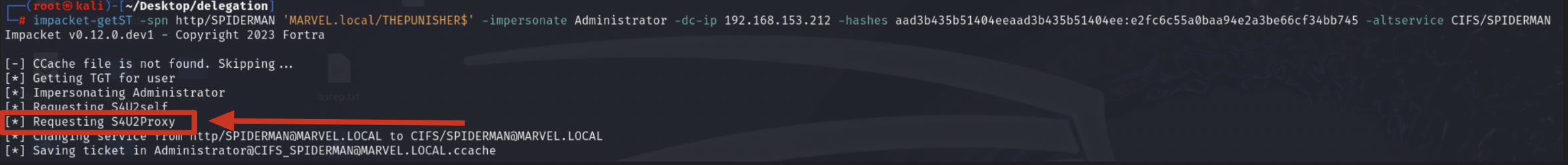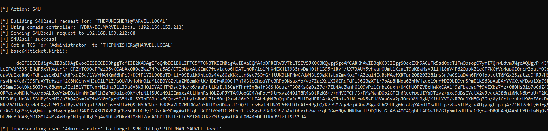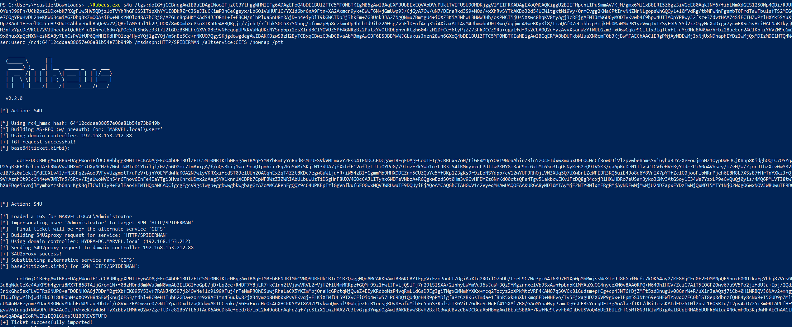 Rubeus now that it has the TGT Ticket of the Computer Account THEPUNISHER$ and the TGS Ticket (belonging to the user MARVEL\Administrator) valid for the CIFS service on the THEPUNISHER$ machine (so, the one received in the previous S4UProxy Response), will be able to use this Ticket as “evidence” and therefore insert it inside the “Additional-Ticket” field in a new “S4UProxy Request”, in this way the attacker will obtain a TGS Ticket (still belonging to the user MARVEL\Administrator) valid for the HTTP service exposed on the SPIDERMAN machine (HTTP/SPIDERMAN), finally, Rubeus will change the HTTP service to the CIFS service, thus obtaining a TGS Ticket (still belonging to the user MARVEL\Administrator) valid for the CIFS service exposed on the SPIDERMAN machine.
