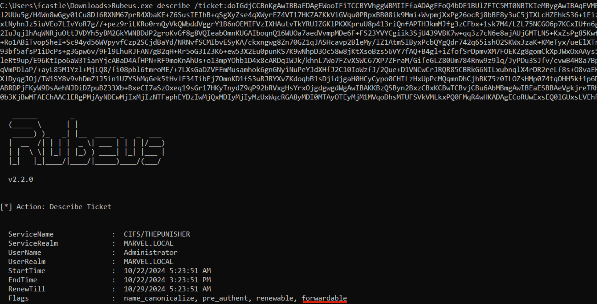 A “TGT Ticket Forwarded” works slightly differently compared to a “traditional” TGT Ticket; specifically, if the attacker obtains a “TGT Ticket Forwarded” of a Computer Account such as THEPUNISHER$ unfortunately it will NOT be possible with it to log on to the SMB share “C$” of the THEPUNISHER machine, consequently it will NOT be possible to log on via PsExec to the target machine.