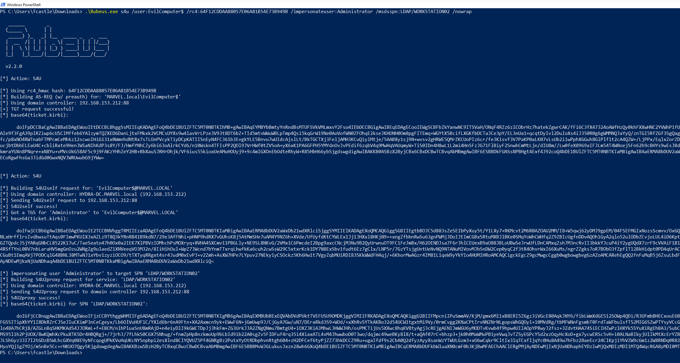 Unlike the Abuse Protocol Transition context where the “/msdsspn” parameter was populated exclusively with the SPN present in the “msds-allowedtodelegateto” property, in the Abuse Kerberos Only context it must be populated with any SPN chosen by the attacker that has the domain user “MARVEL\userz” as the Service Account (since in our example the Service Account MARVEL\userz has exclusively the SPN string LDAP\Workstation02, it will be necessary to insert this value), all of this will work because the KDC will use the previously configured RBCD.