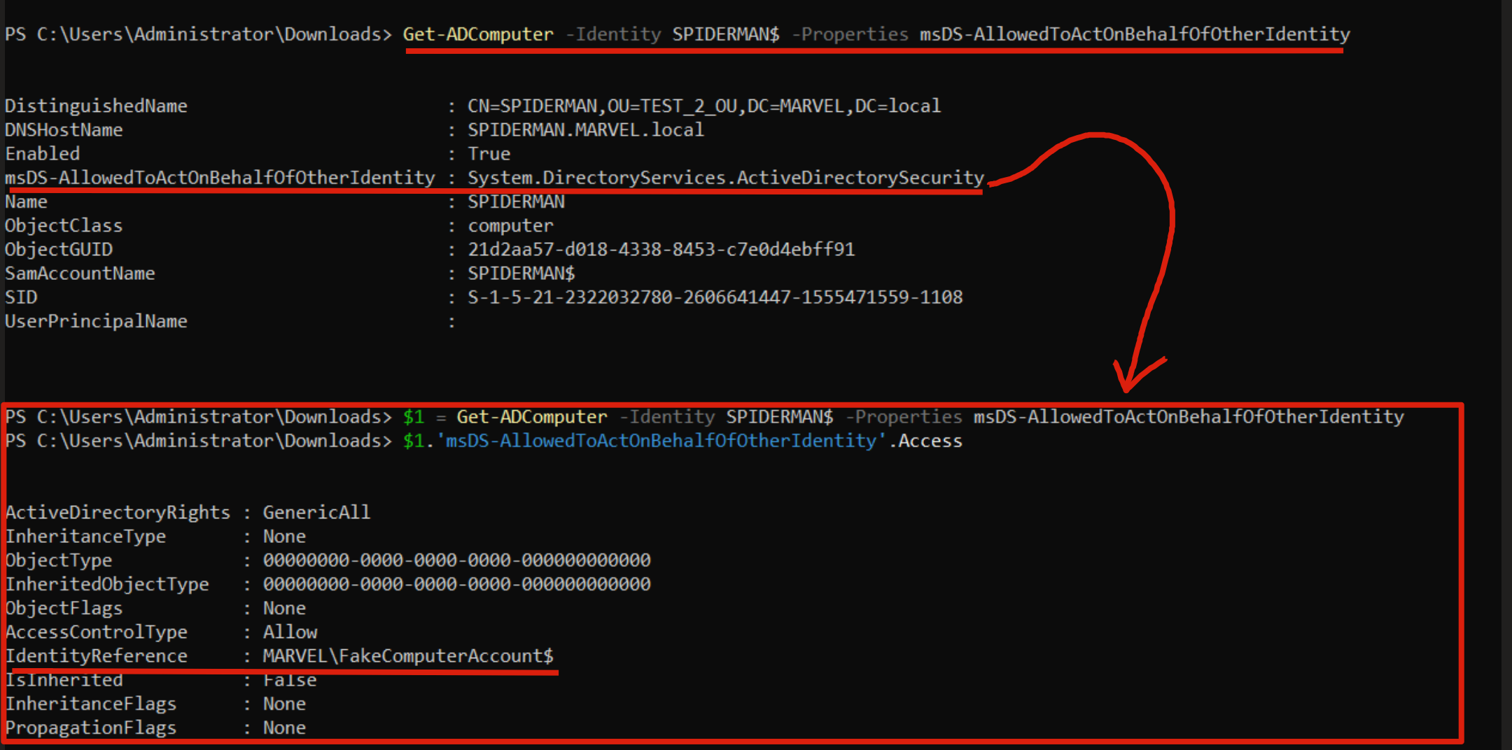 via “Get-ADComputer” (requires RSAT) it is noticeable that the value “MARVEL\EvilComputer$” is actually present.