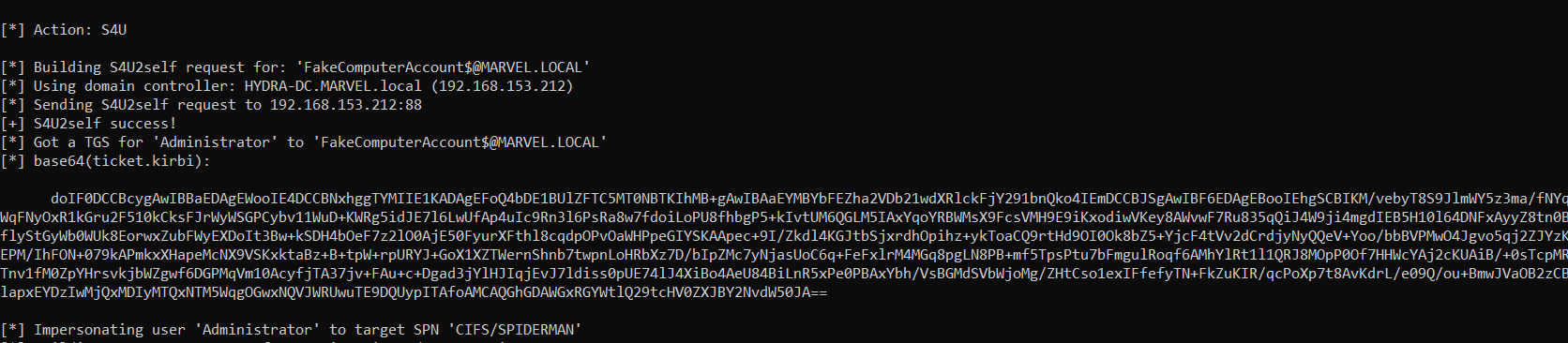 Rubeus now that it has the TGT Ticket of the Computer Account THEPUNISHER$ and the TGS Ticket (belonging to the user MARVEL\Administrator) valid for the CIFS service on the THEPUNISHER$ machine (so, the one received in the previous S4UProxy Response), will be able to use this Ticket as “evidence” and therefore insert it inside the “Additional-Ticket” field in a new “S4UProxy Request”, in this way the attacker will obtain a TGS Ticket (still belonging to the user MARVEL\Administrator) valid for the HTTP service exposed on the SPIDERMAN machine (HTTP/SPIDERMAN), finally, Rubeus will change the HTTP service to the CIFS service, thus obtaining a TGS Ticket (still belonging to the user MARVEL\Administrator) valid for the CIFS service exposed on the SPIDERMAN machine.