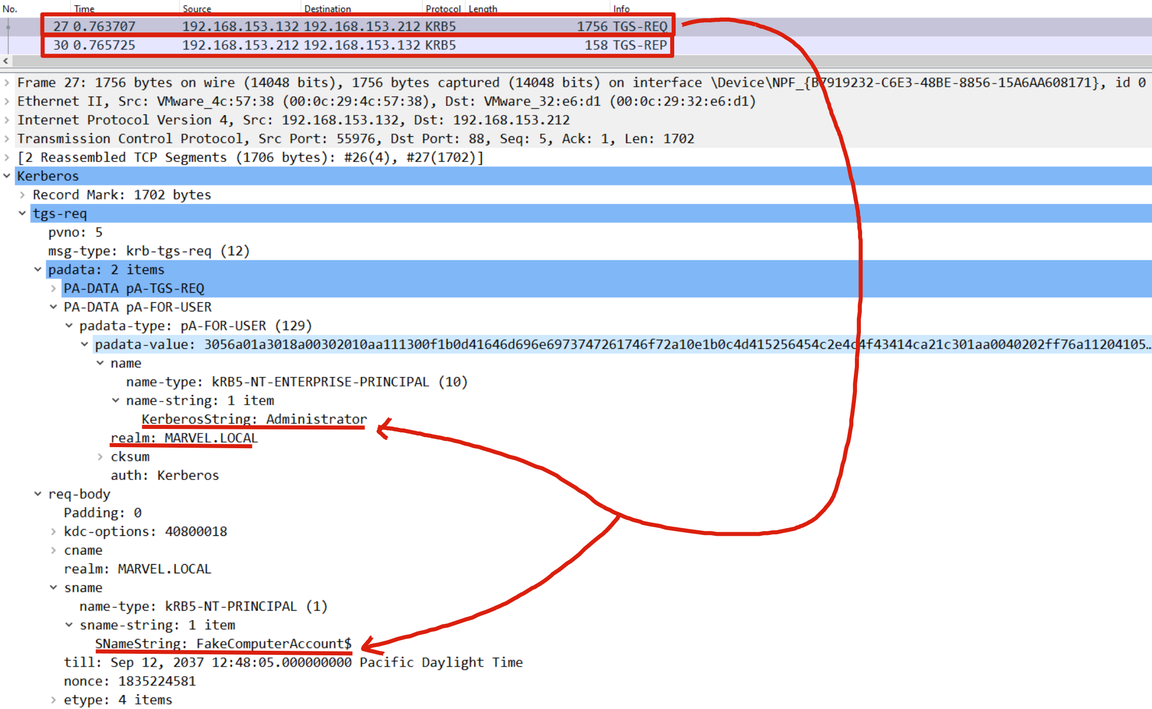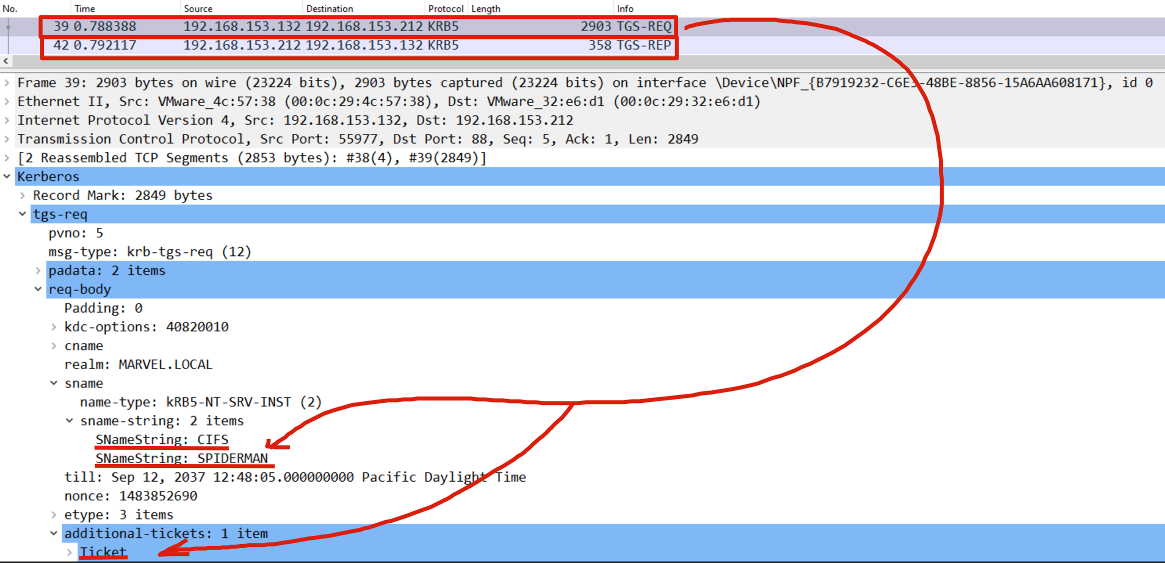 As we can see, Rubeus sends a “KRB_TGS_REQ (S4UProxy)”, analyzing the content of the packet it can be noted that: 1) Inside the “Additional Ticket” field the TGS Ticket previously received in the “S4UProxy Response” is indeed sent (so the Ticket inserted by the attacker in the /ticket parameter) 2) The SPN that points to the service the compromised machine (Computer Account THEPUNISHER$) is authorized to access on behalf of the Client (indicated in the “msds-allowedtodelegateto” flag (1, 2), in fact the SPN “HTTP/SPIDERMAN.MARVEL.local” is present.