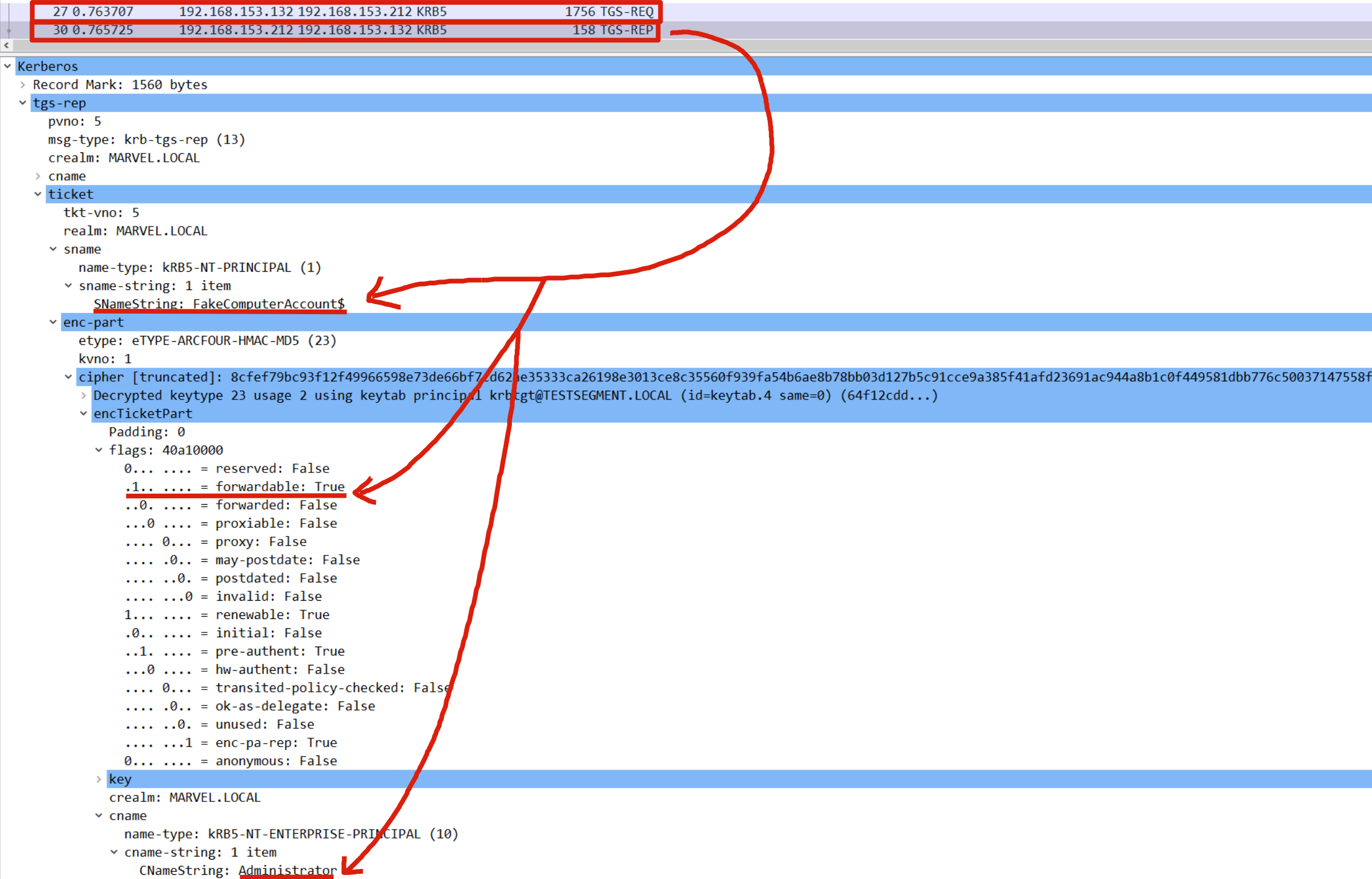 This Ticket TGS will be issued with the FORWARDABLE flag at 1 (briefly: because “EvilComputer$” does NOT have “Kerberos Only enabled”)