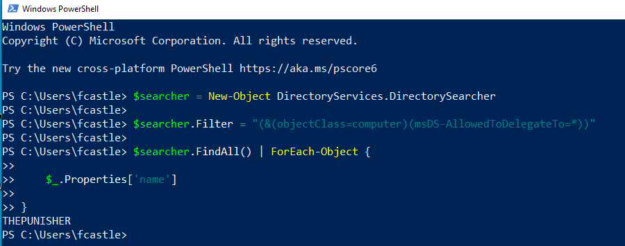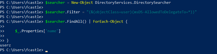 PS C:\> $searcher = New-Object DirectoryServices.DirectorySearcher $searcher.Filter = "(&(objectClass=user)(msDS-AllowedToDelegateTo=*))" $searcher.FindAll() | ForEach-Object { $_.Properties['name'] }