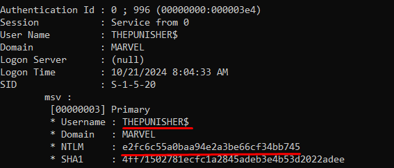 In this scenario, the attacker managed to authenticate with administrative permissions on the THEPUNISHER machine and, by dumping LSASS, obtained the credentials of the THEPUNISHER$ Computer Account, so, the Service Account with Constrained Delegation (Kerberos Only) enabled.