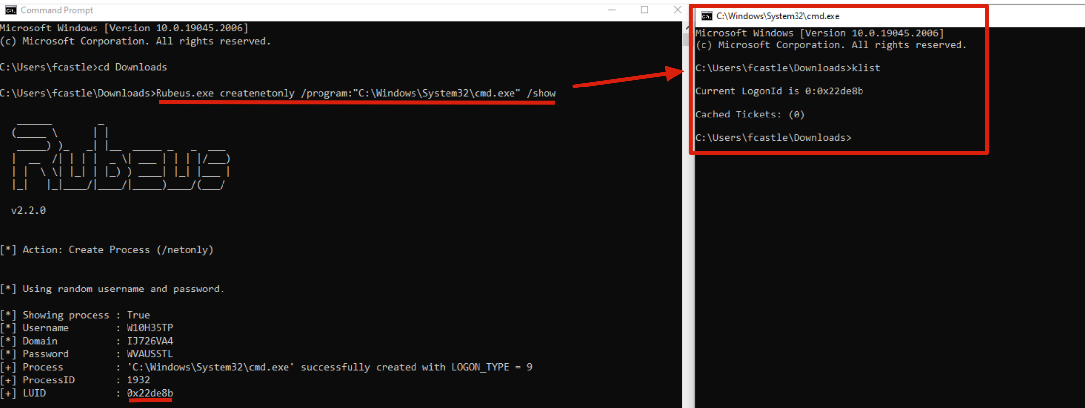 C:> Rubeus.exe createnetonly /program:"C:\Windows\System32\cmd.exe" /show