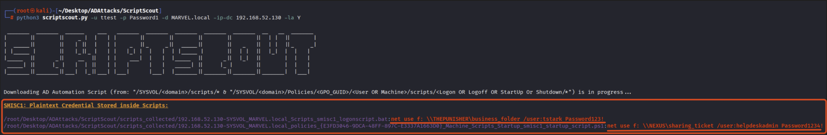 By running ScriptScout, it can be observed that it has identified 1 Logon Script (probably configured via “ScriptPath” property) and 1 StartUp Script (configured via Group Policy Script) that map network SMB shares specifying domain credentials in clear text such as: “helpdeskadmin”-“Password1234!” & “tstark”-“Password123” inside the “net use” command.