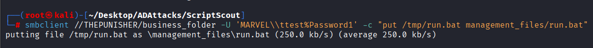 # smbclient //<hostname-ip_dc>/SYSVOL -U '<domain>\\<domain_user>%<password>' -c "put <local_file>/<automationscript_name> <fullpath_automationscript>"
