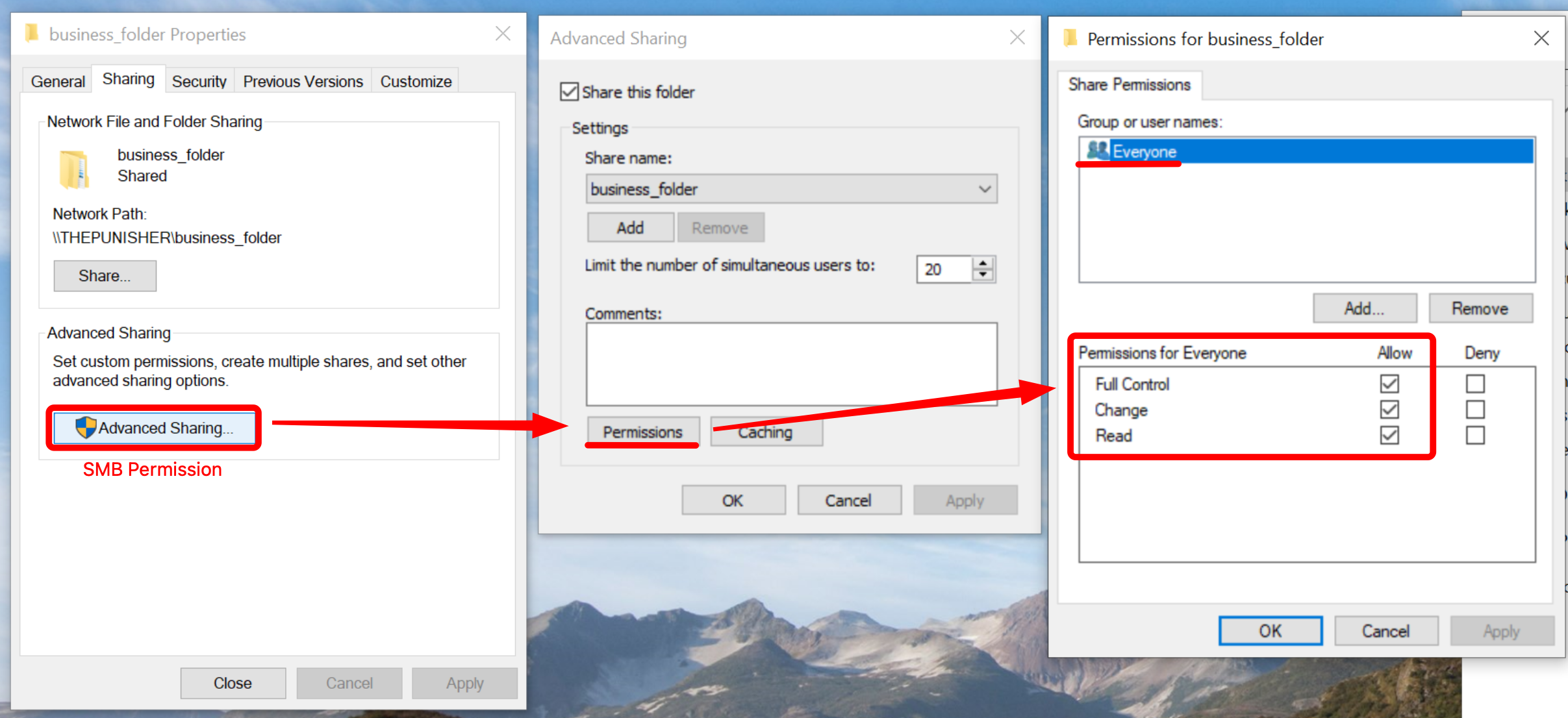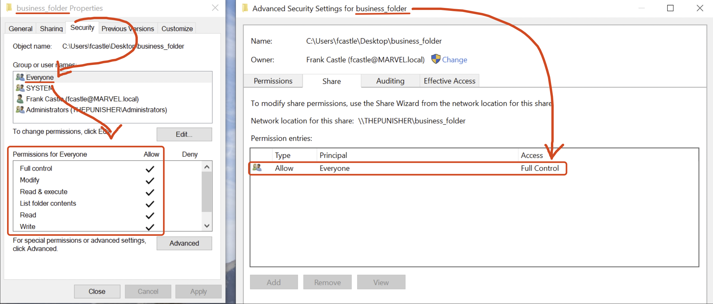 Below are the permissions at the SMB (network share) level (which ScriptScout is NOT able to detect), as you can see the “Everyone” group has FullControl permissions and in fact the modification was successful.