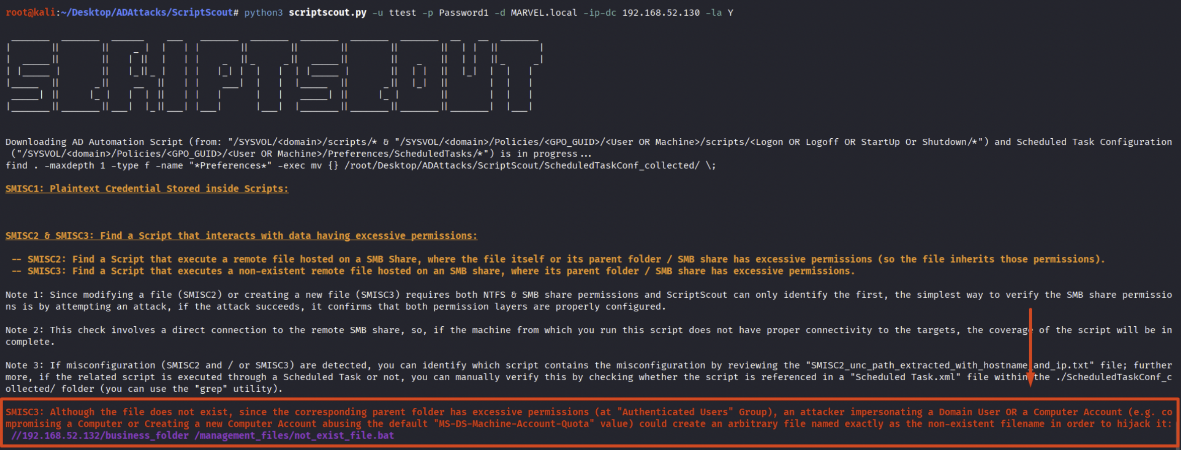Regarding SMISC2, SMISC3 and SMISC4, ScriptScout will also specify to which group the excessive permissions have been assigned, namely: “Everyone” or “Domain Users”, “Authenticated Users” and “Domain Computers”; this logic is deliberately implemented as it gives more flexibility to the Red Teamer, for example in a “Authenticated Users” scenario the Red Teamer could impersonate a Computer Account instead of the regular Domain User to perform the exploitation.