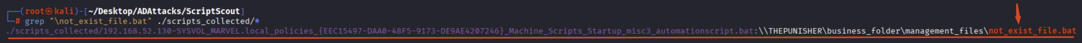 Furthermore, since ScriptScout saves all “Automation Scripts” inside the “script_collected” folder created in the current directory from which the tool has been launched, by performing a simple “grep” it is possible to determine which “Automation Script” contains the execution of the remote file located at \\192.168.52.132\business_folder\magement_file\not_exist_file.bat; in this case, by examining the path “\policies\GUID\Machine\Startup” we understand that such “Automation Script” is actually a Startup Script configured through GPO (specifically as a Group Policy Script).